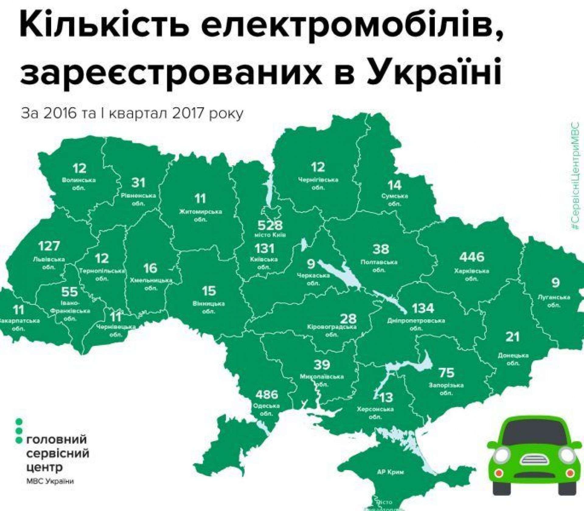 На сайті головного сервісного центру МВС з’явилася дані про електромобілі в Україні. А саме, скільки їх було зареєстровано за 2016 рік та 1 квартал 2017 року. Загалом, як пишуть на ресурсі сервісного центру, було зареєстровано 2284 авто. Тоді як у Вінницькій області — тільки 15 електроавто.
