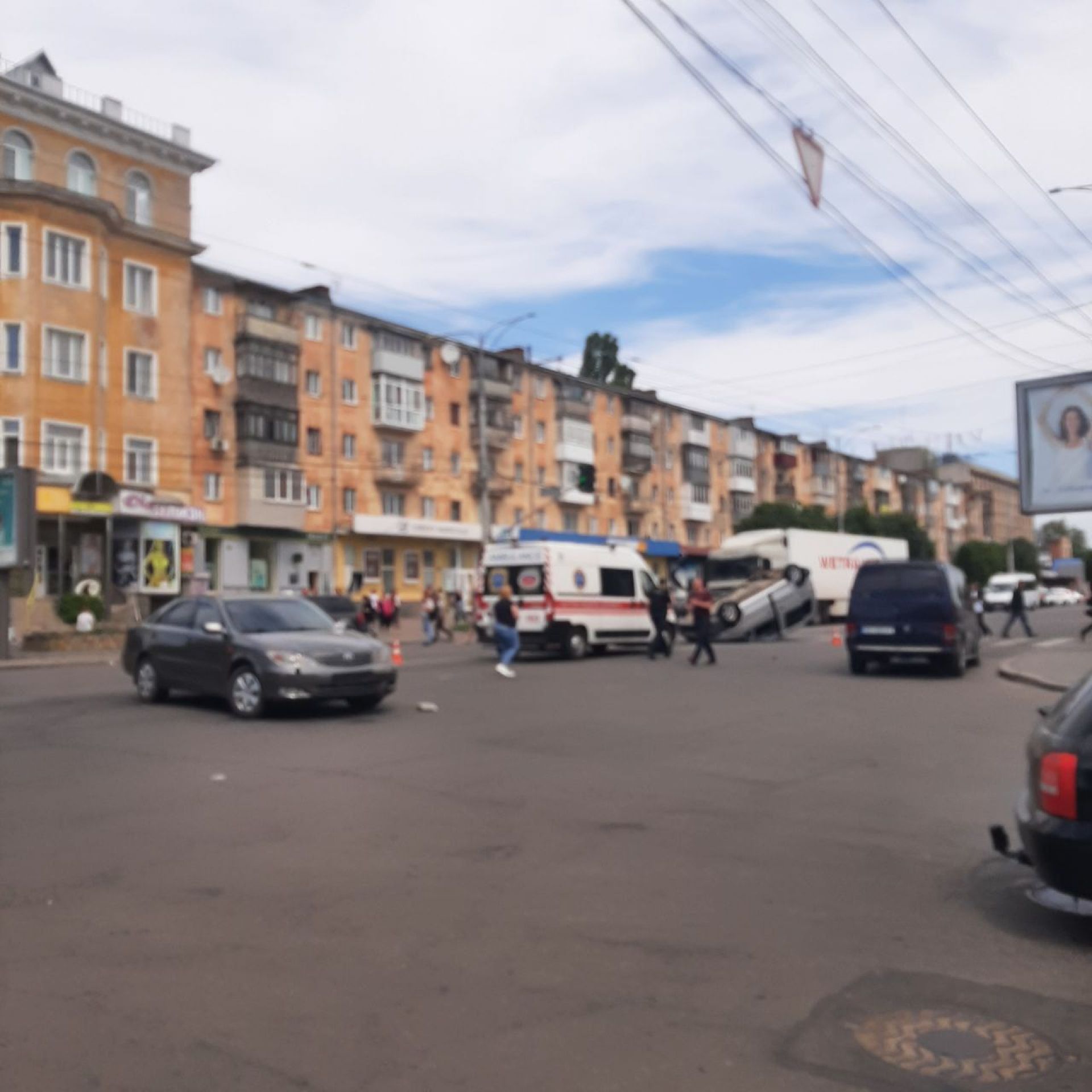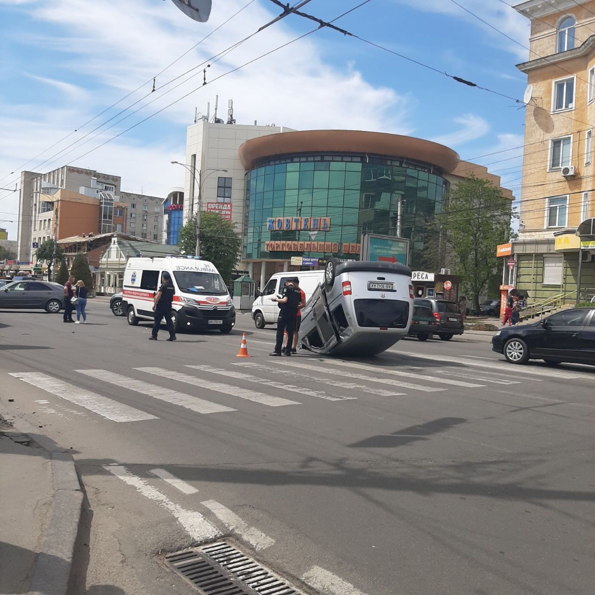 - У ДТП потрапили дві машини. Одна із них перекинулася на дах. На місці події працює поліція та бригада швидкої.