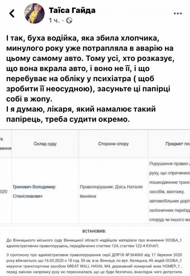 Громадська діячка Таїсія Гайда опублікувала в Фейсбуці допис, в якому йдеться про те, що ця водійка в минулому році мала адміністративне порушення і звати її Наталія Дзісь.