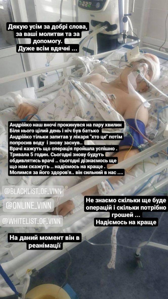 Сьогодні в обід хлопчик прийшов до тями, всіх впізнавав і просив поїсти. Ось такий пост вранці опублікувала в сторіс Інстаграму сестра потерпілого в ДТП Андрія: