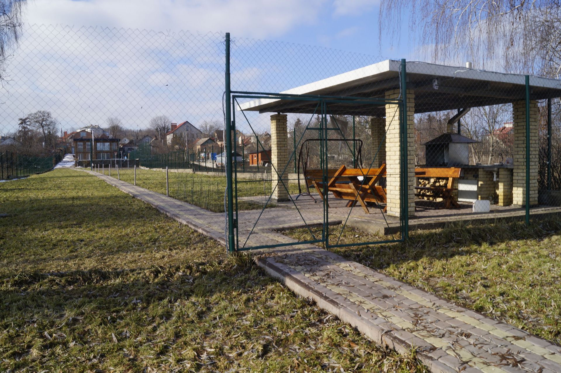 Одразу за пляжем стоїть високий паркан гарного будинку. Біля нього доріжки, вимощені плиткою, які ведуть до самої річки.