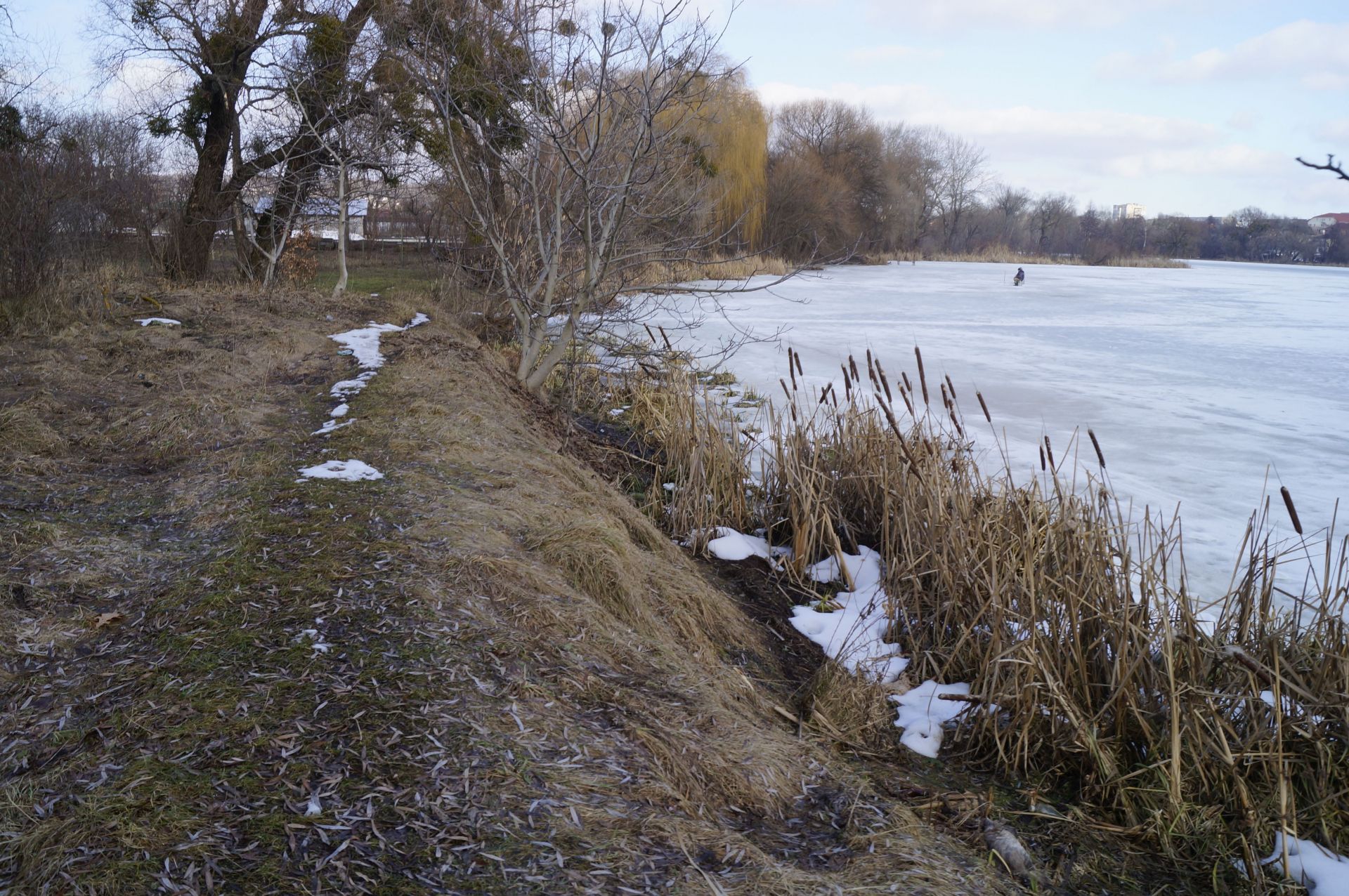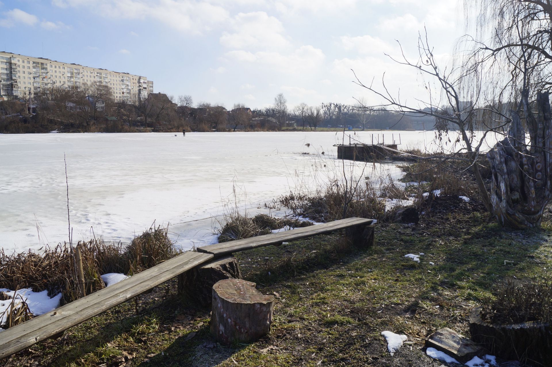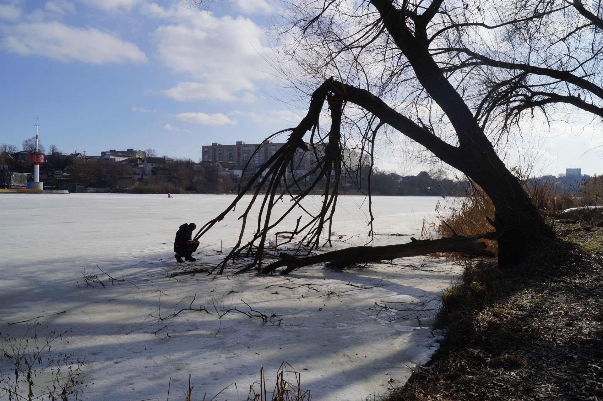 Ми зустрічаємо дідуся, який прогулюється по кризі. Розповідає, що живе на провулку Івана Богуна, гуляти Бугом не боїться, показує, що крига товста. Але попереджає, що не варто заходити далі рятувальної станції, бо там рибалки могли наробити ополонок.