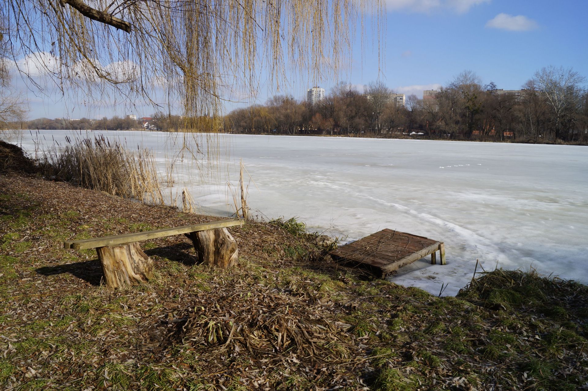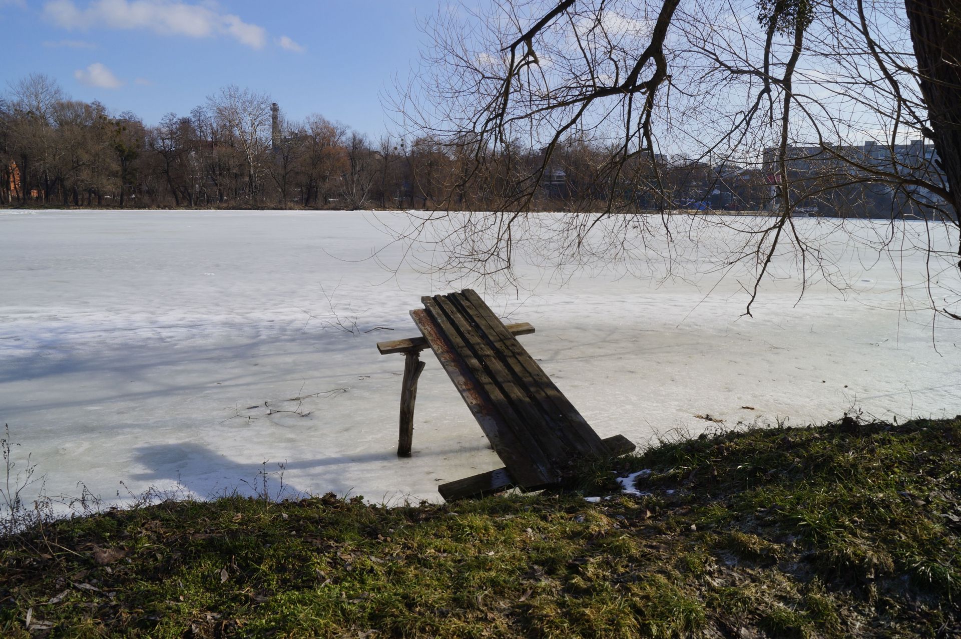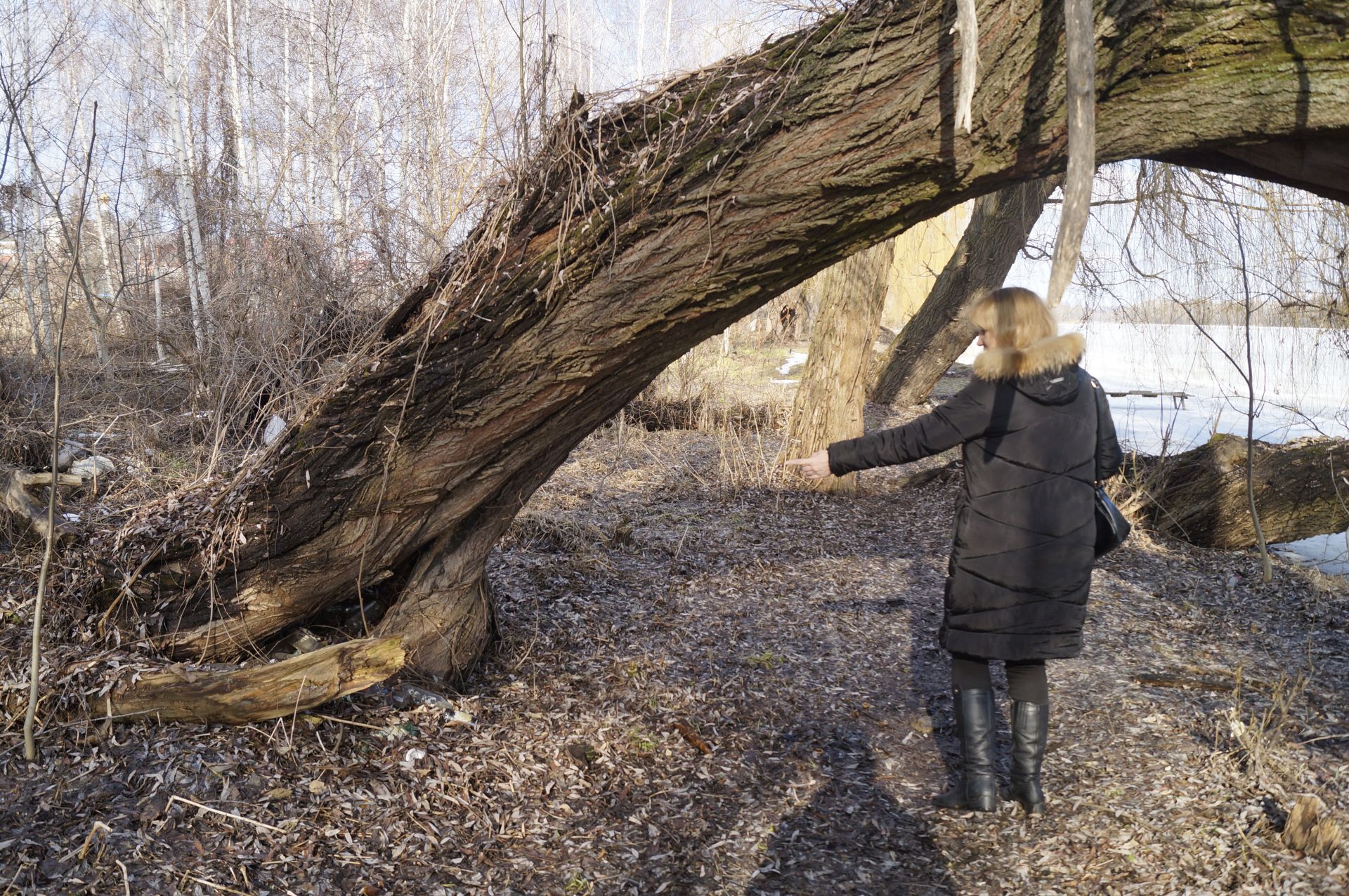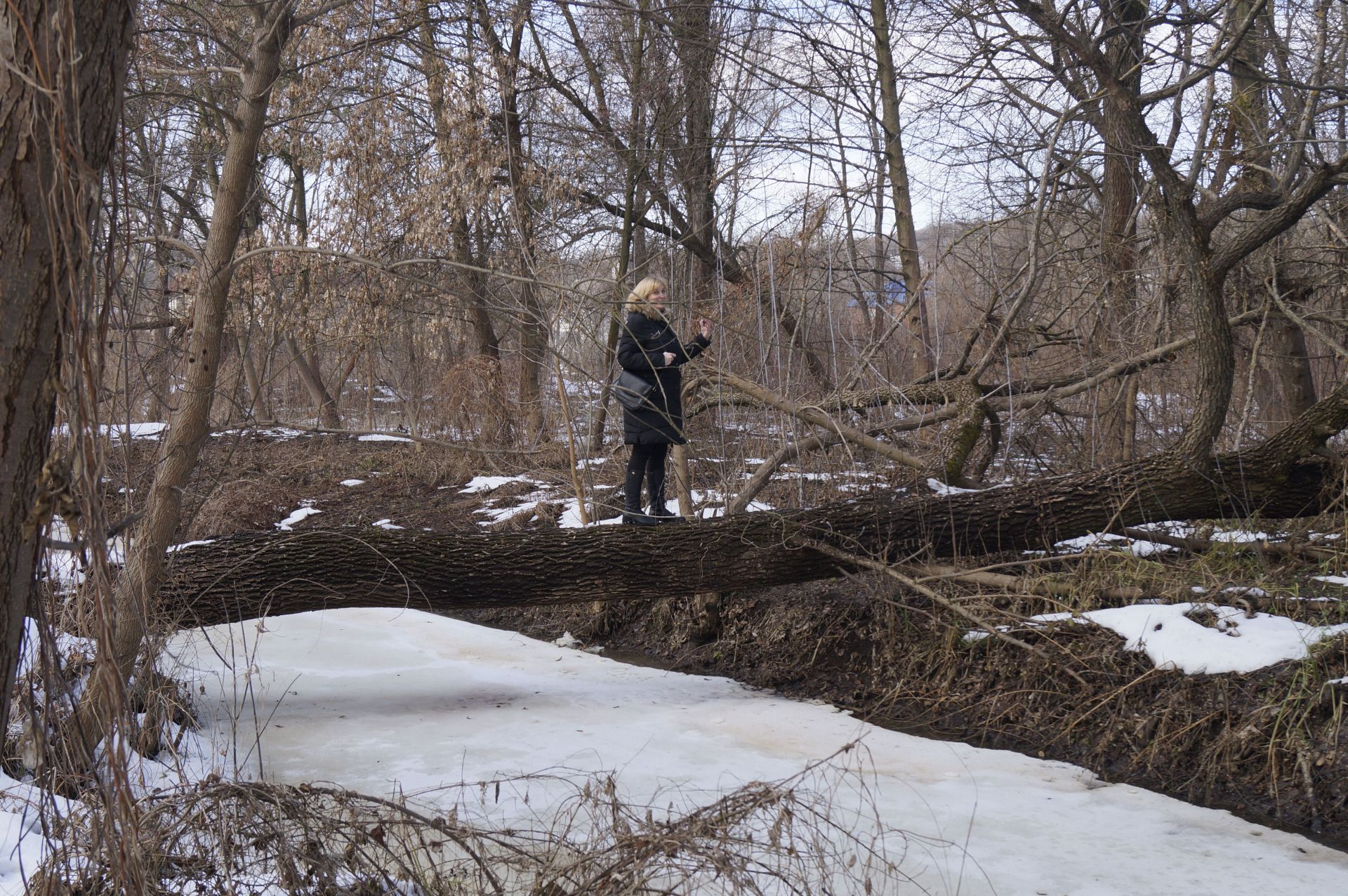 Ми зустрічаємо дідуся, який прогулюється по кризі. Розповідає, що живе на провулку Івана Богуна, гуляти Бугом не боїться, показує, що крига товста. Але попереджає, що не варто заходити далі рятувальної станції, бо там рибалки могли наробити ополонок.