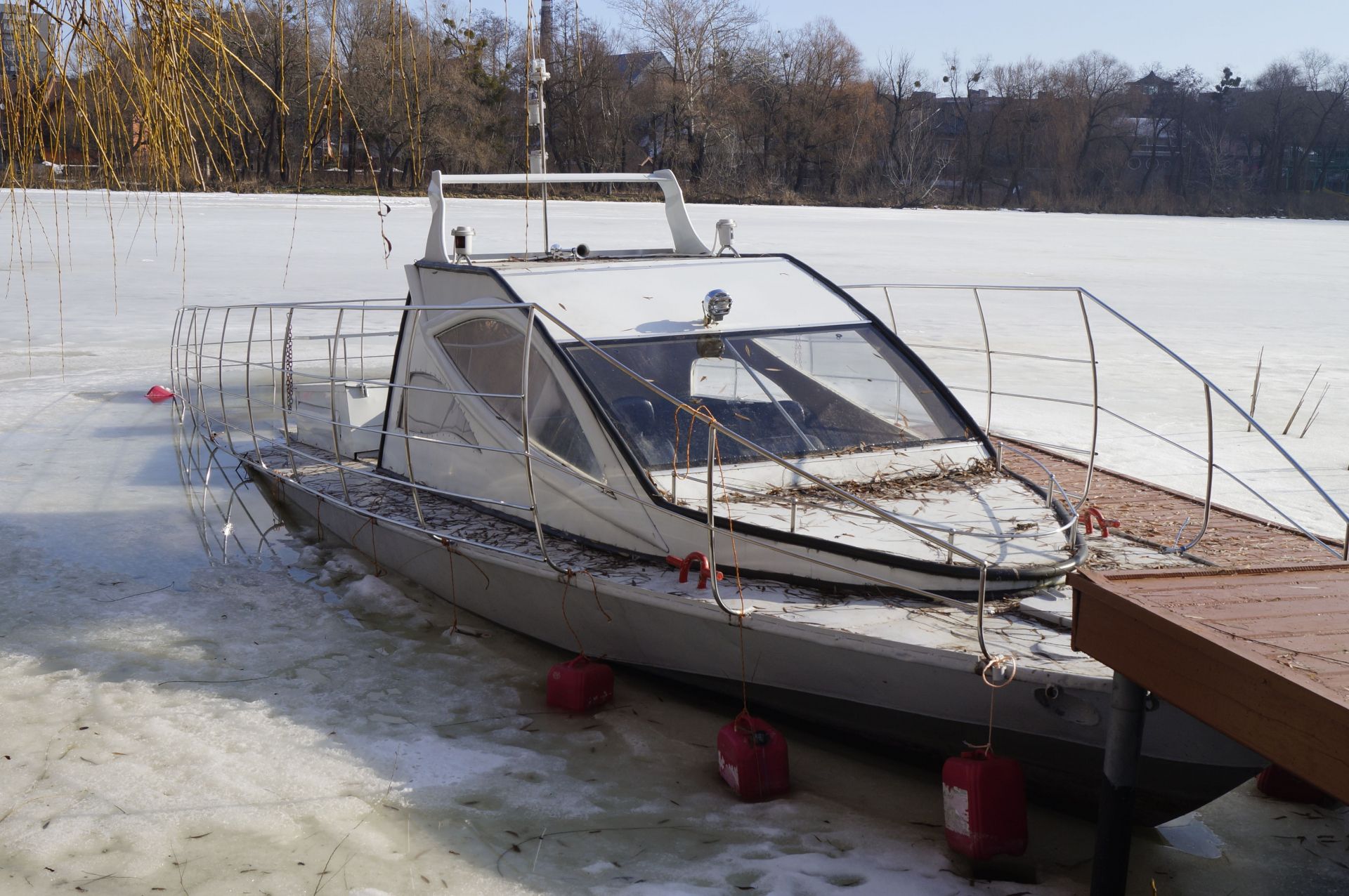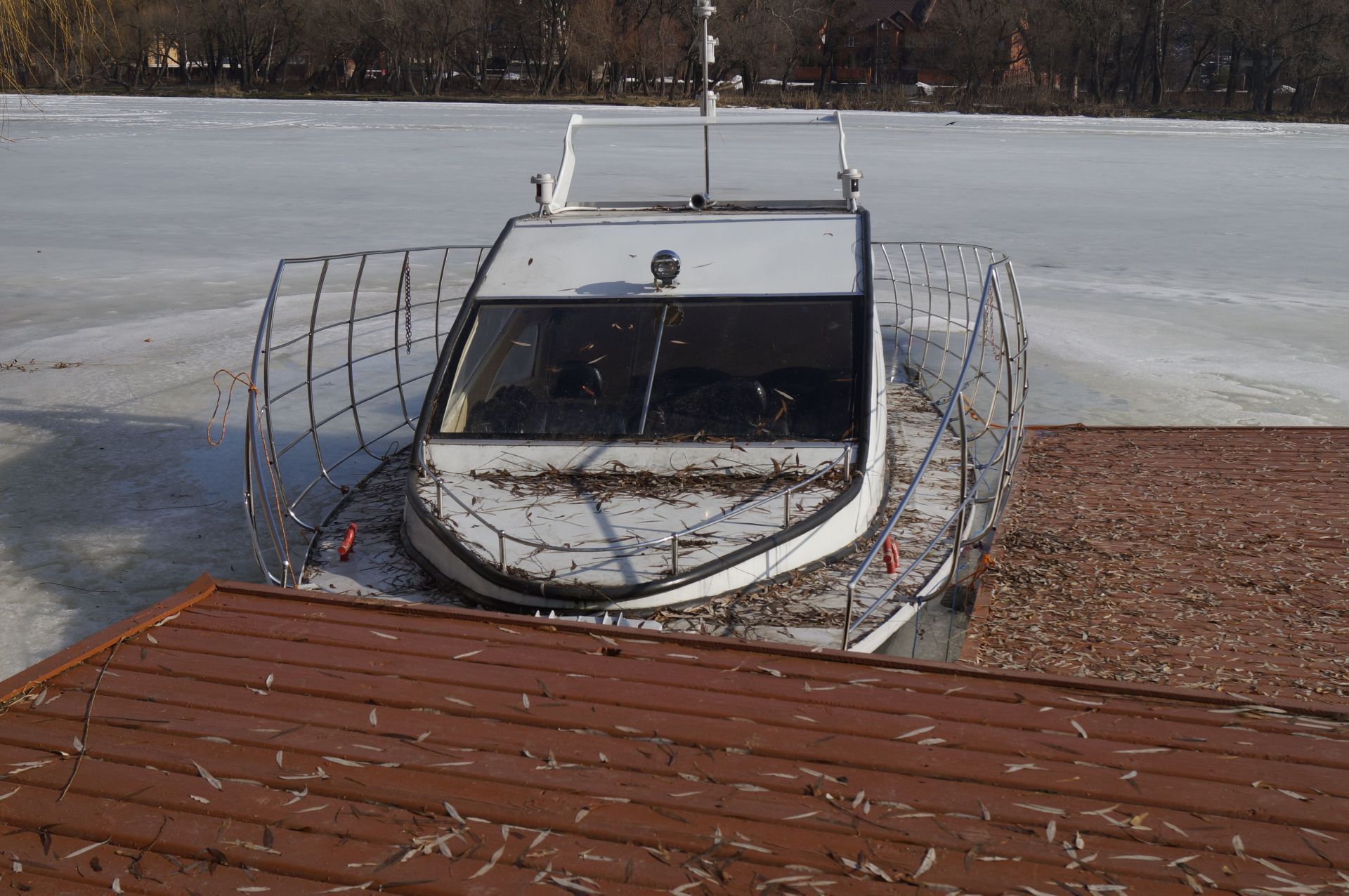 По дорозі зустріли катер, який залишили на річці і він вмерз у воду. Вочевидь, його власники живуть у будинку поряд. Їх господарство огороджене парканом, але він не доходить до річки. З цієї території нас обгавкали два величезних пси.