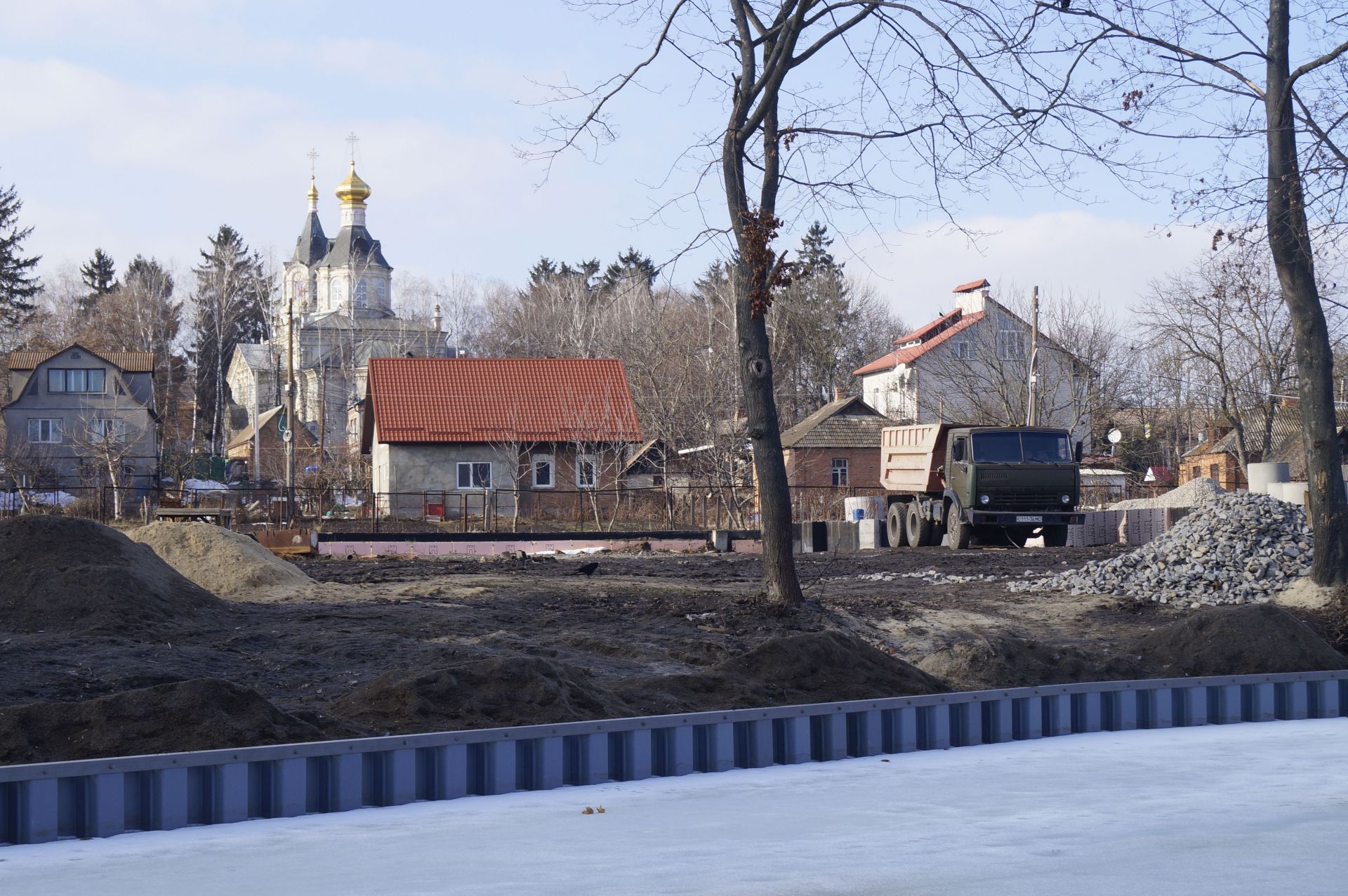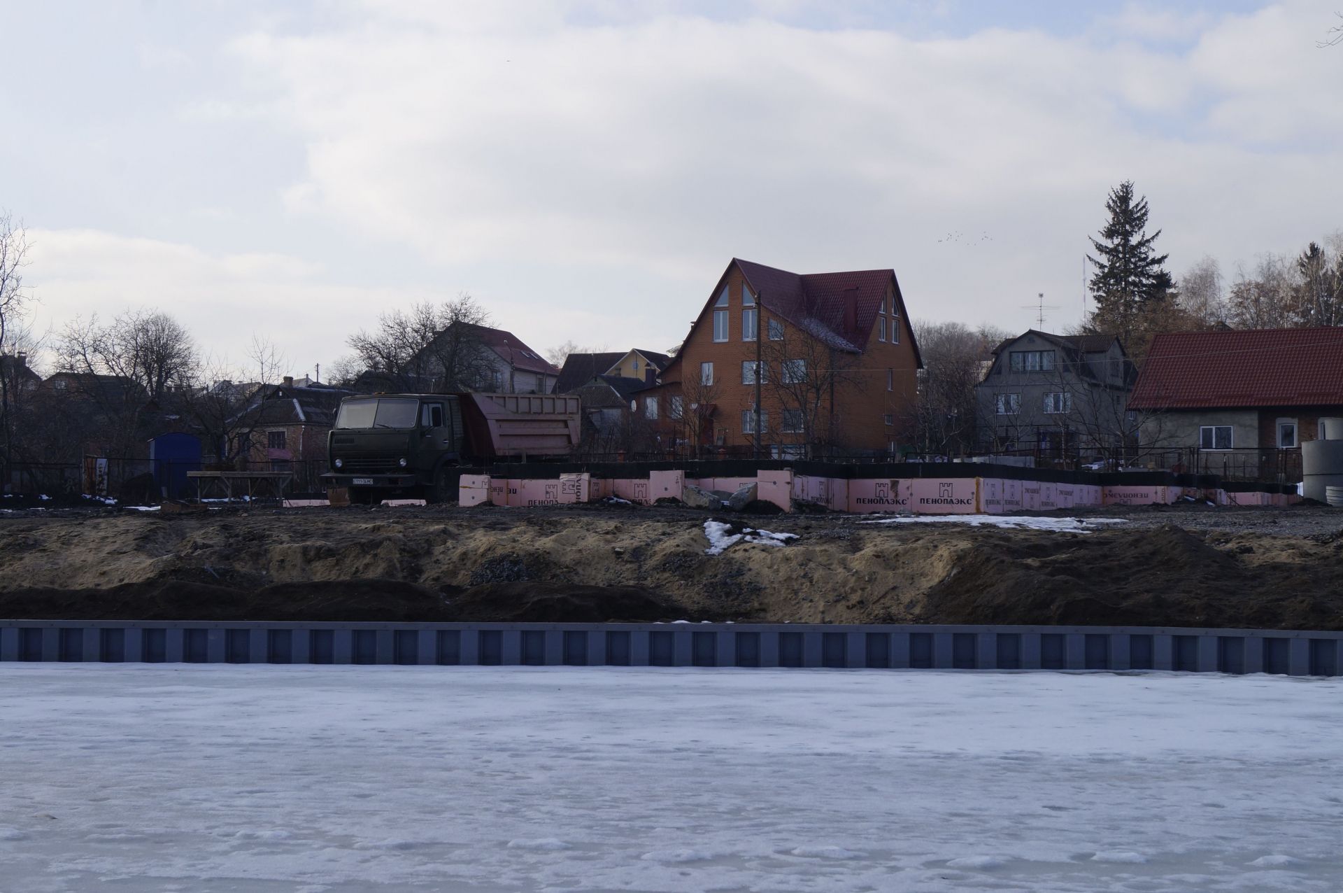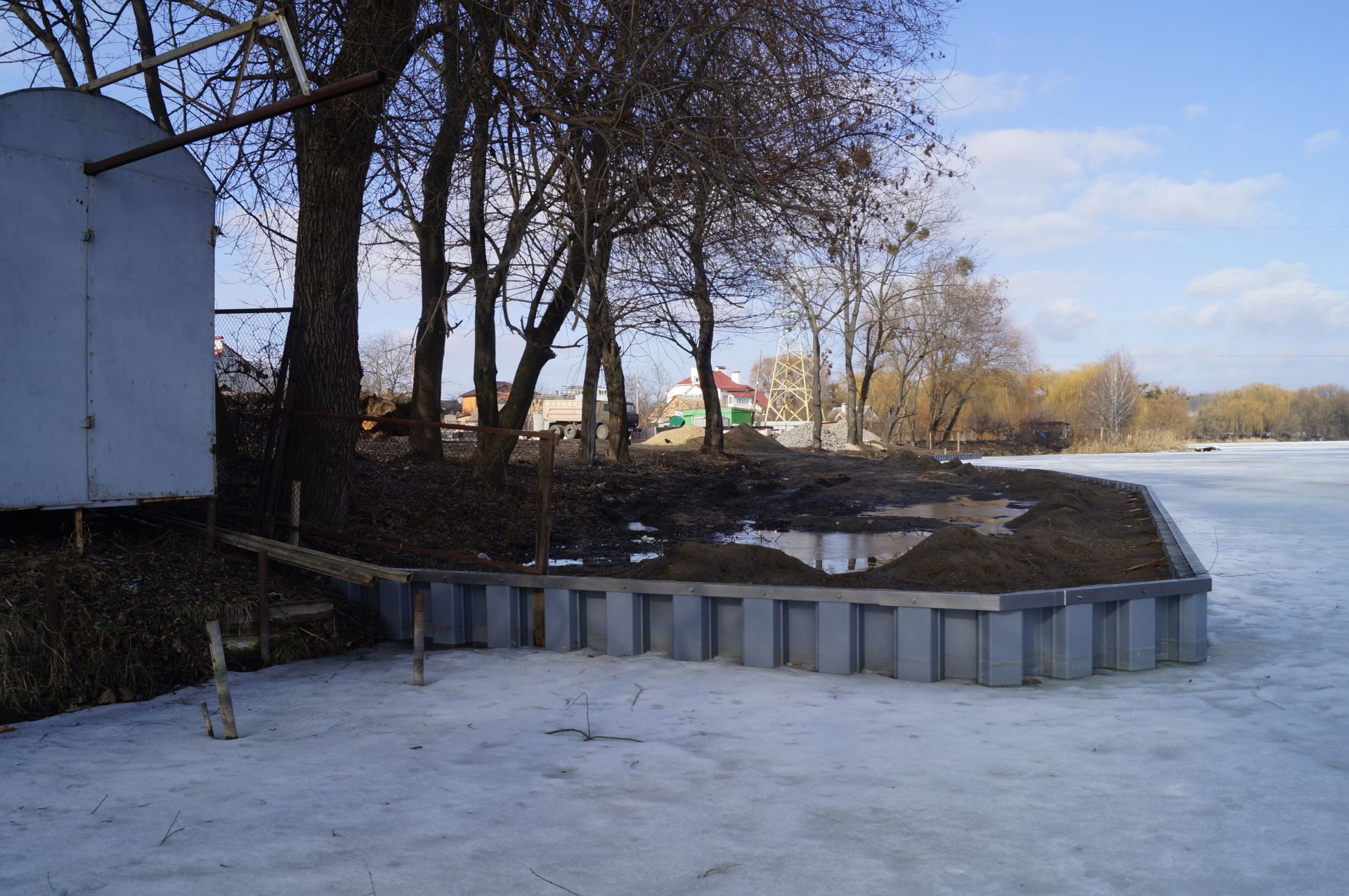 Трохи далі розгорнули будівництво. Тут «нарощують» берег за рахунок річки. Обійти це все можна лише по льоду. Вхід на територію огороджений.