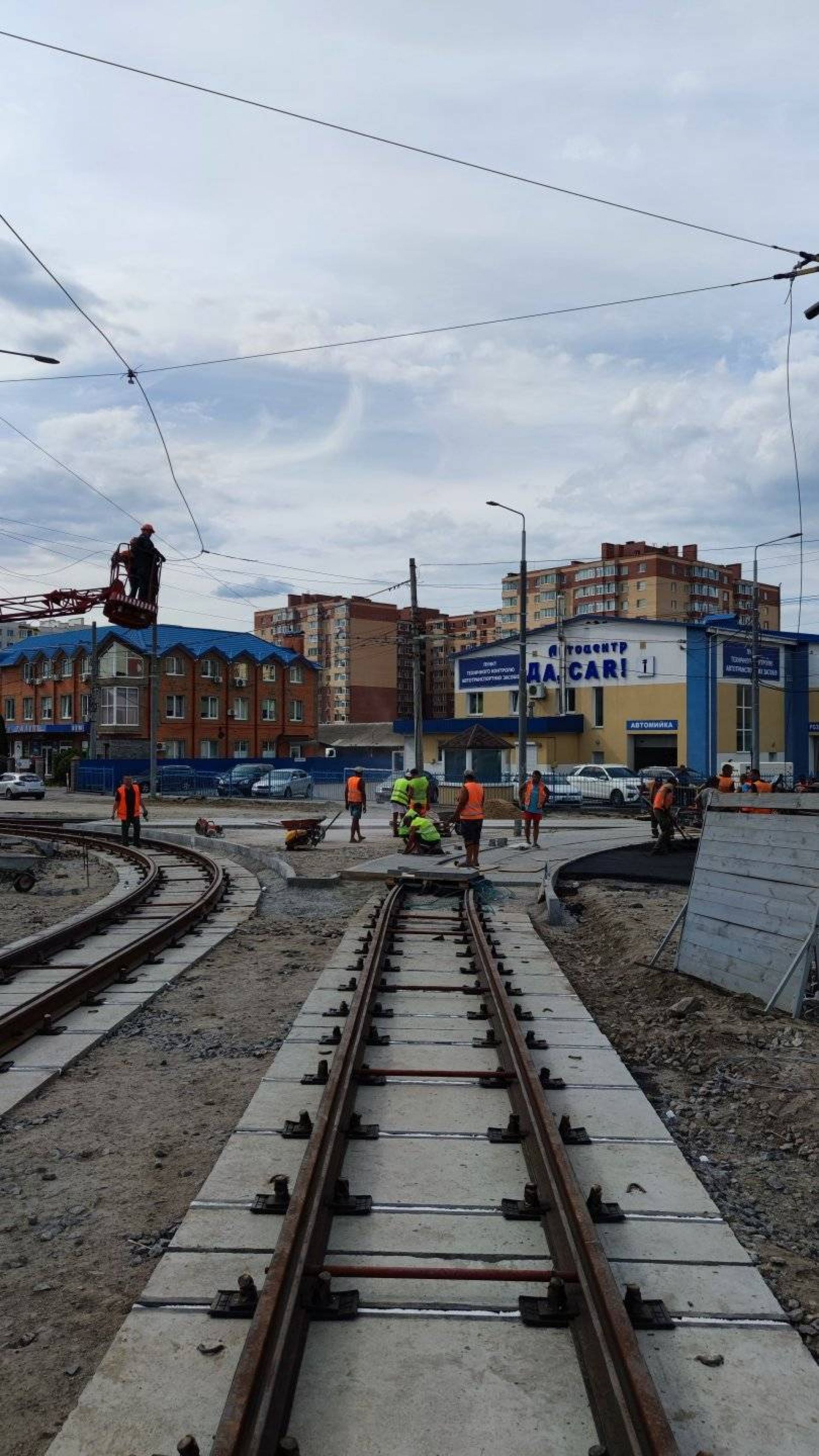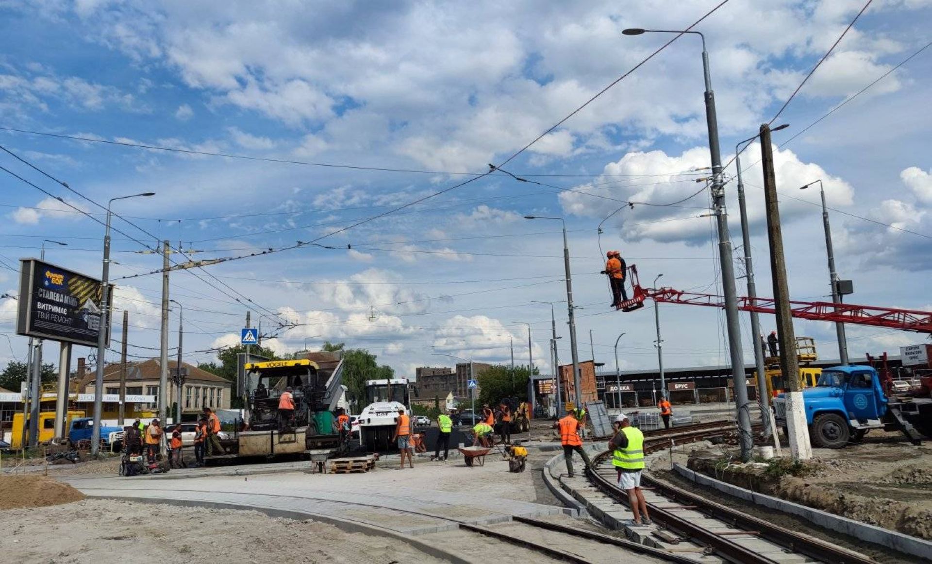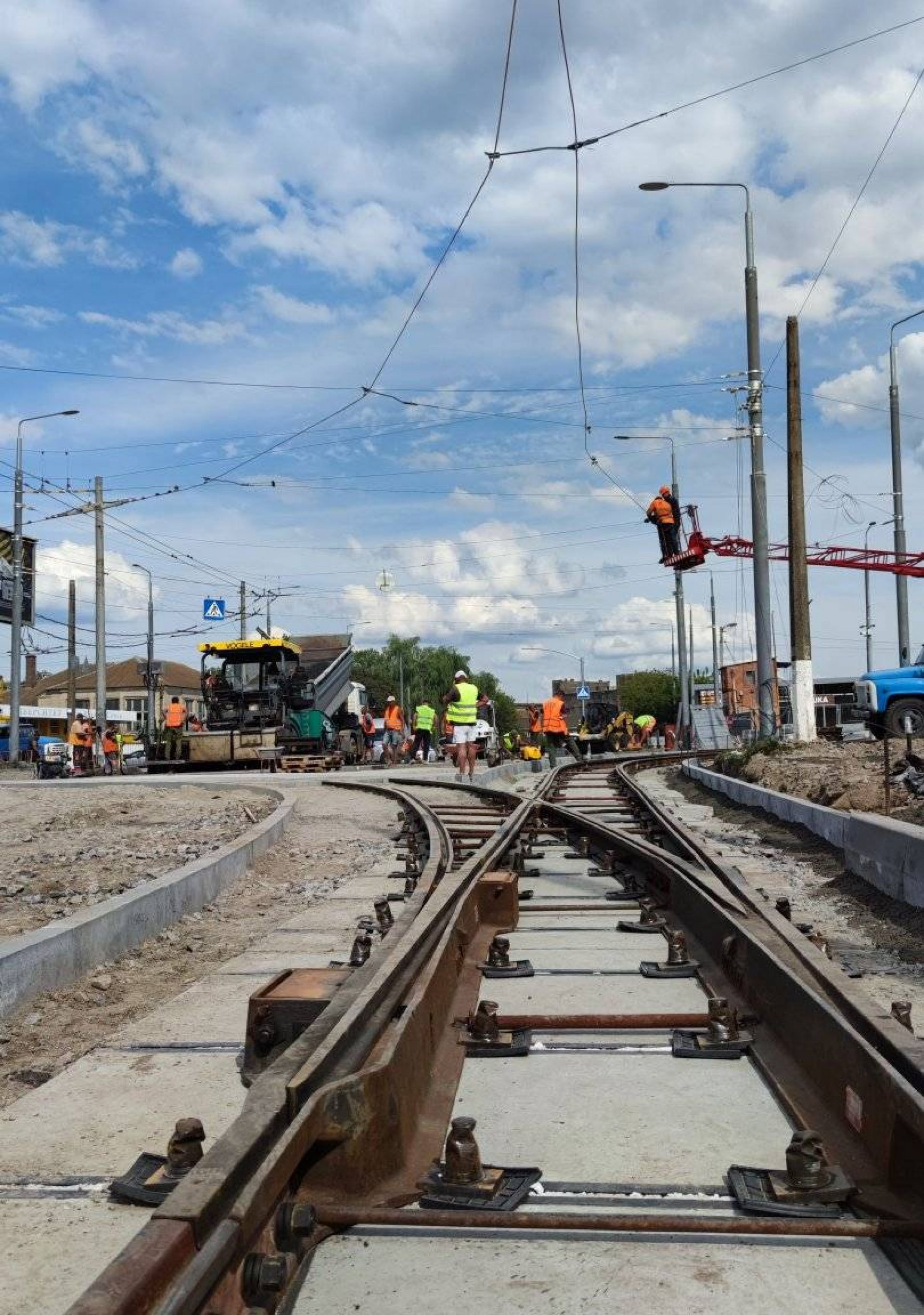 До речі 10 серпня Віктор Перлов поділився фото та підписав їх: «Триває облаштування трамвайного перетину перехрестя Батозька-Янгеля. Укладено плити основи та трамвайні колії, постелено значну частину асфальтового покриття, монтується контактна мережа».