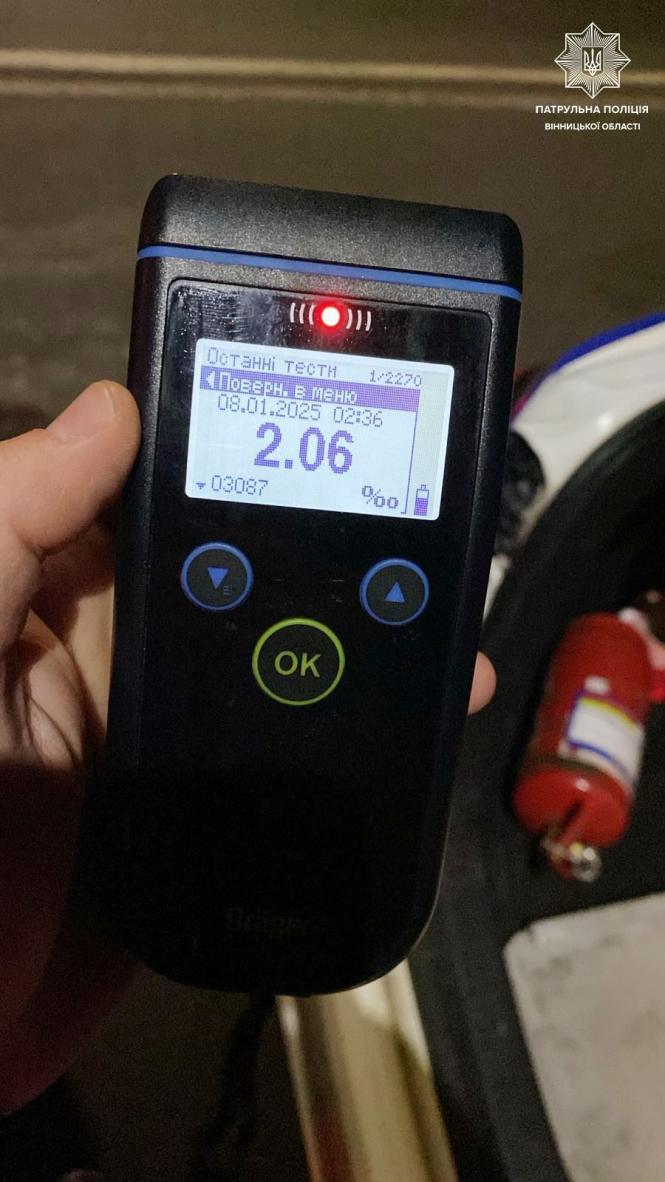 — Перевіряючи його документи, інспектори помітили в чоловіка ознаки сп'яніння: запах алкоголю з порожнини рота, порушення мови та поведінку, що не відповідала обстановці, — йдеться у повідомленні. — Водієві запропонували пройти перевірку на спецприладі Драгер. Результат показав, що в організмі чоловіка було 2,06 проміле алкоголю, а це більш ніж у 10 разів перевищує допустиму норму.