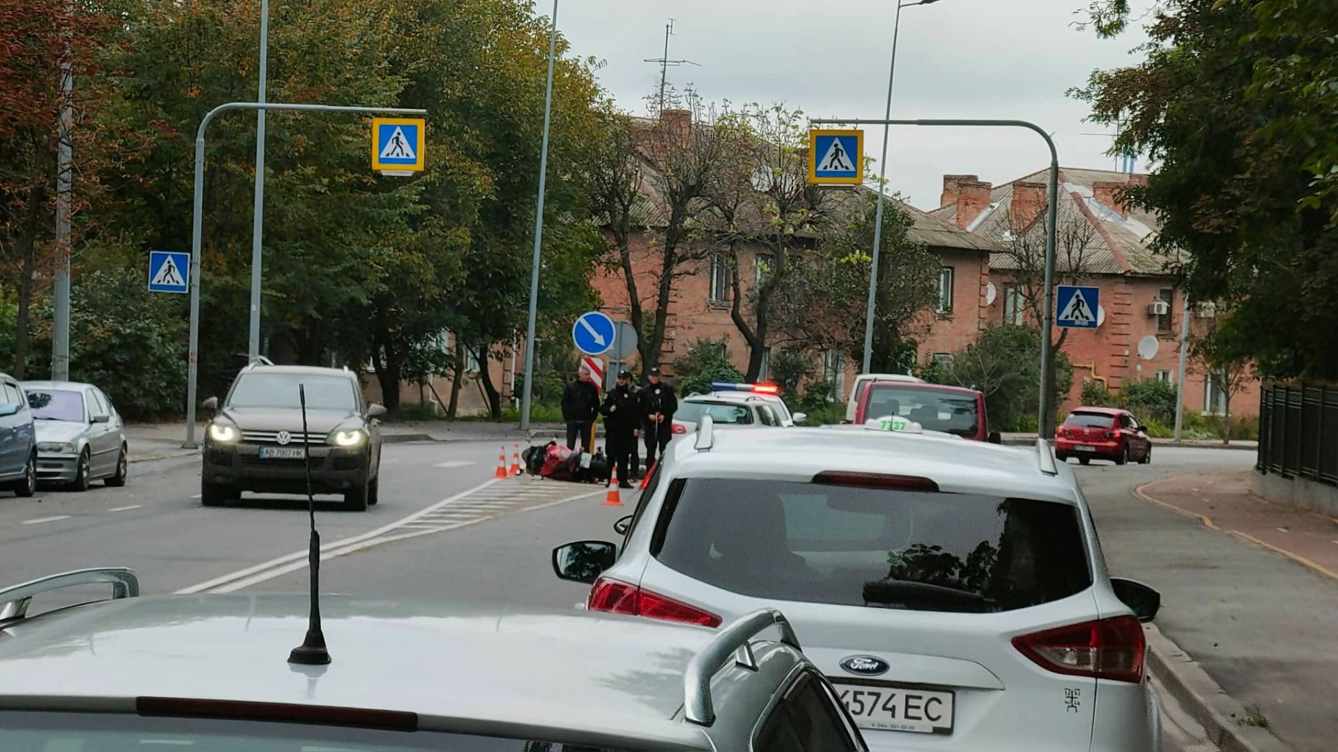 Перекинутий червоний мотоцикл, машина на аварійці та поліція — картина, яку застала на Магістратській журналістка «20 хвилин».