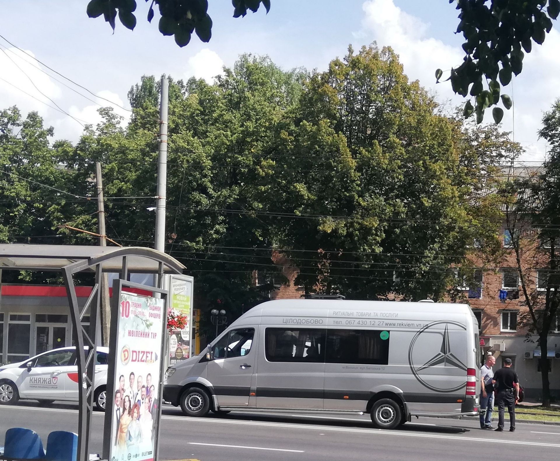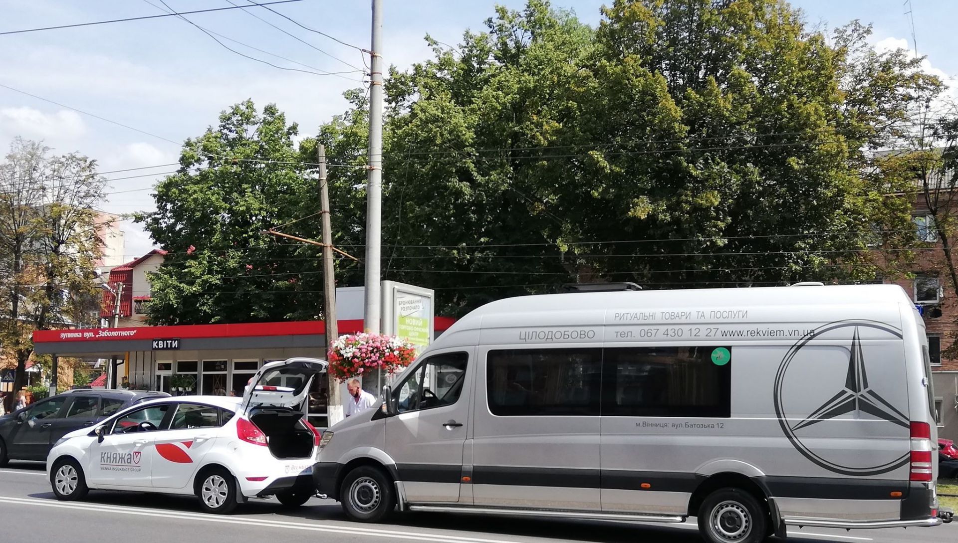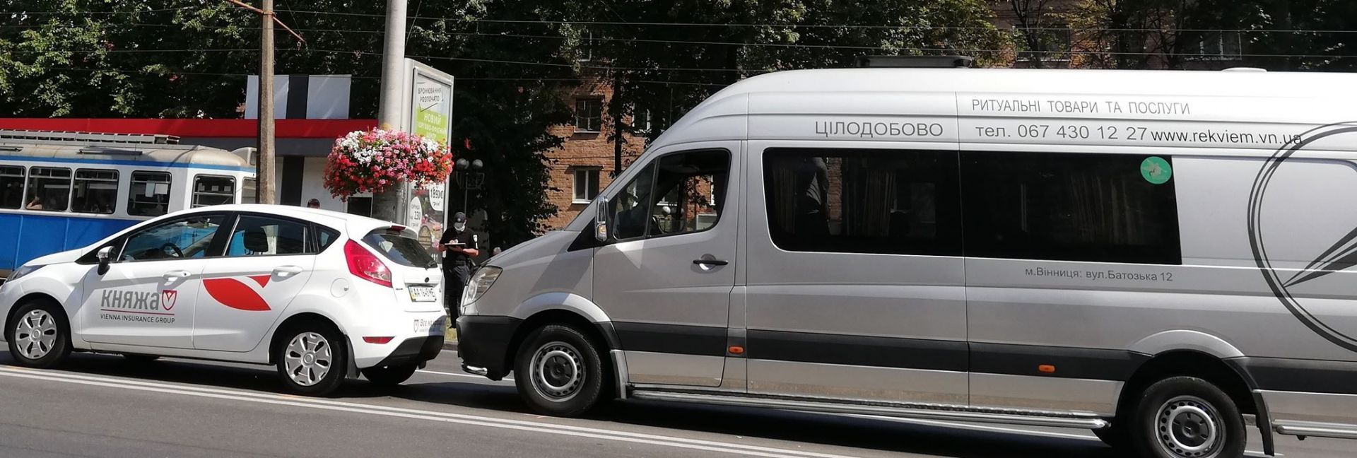 Мікроавтобус має напис «Ритуальні товари та послуги». Тим часом, легковик належить страховій компанії «Княжа».