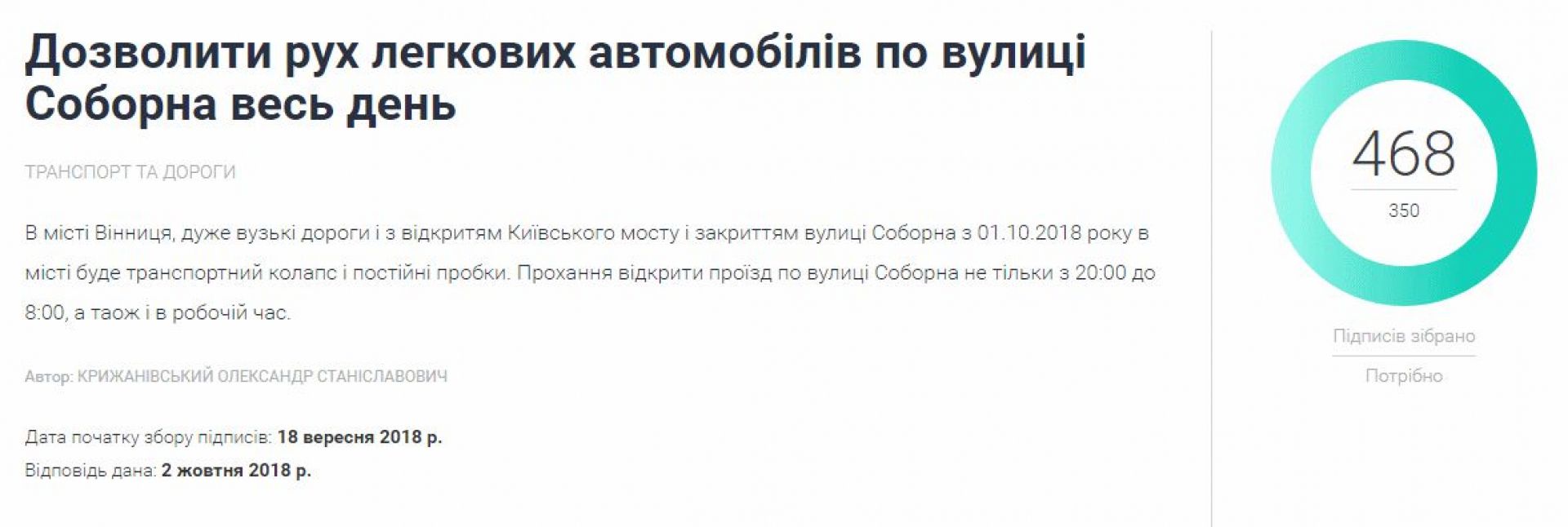 Петиція швидко набрала потрібну кількість необхідних голосів… і навіть більше — забрала понад 450 підписів. У вівторок, 2 жовтня 2018 року, на сайті вінницької мерії виклали відповідь. Якщо коротко, то повідомляють «для відкриття руху приватних транспортних засобів по вул. Соборній у денний час на сьогоднішній день відсутні підстави». Зокрема, у тексті відповіді зазначають, що вулиця Соборна є центральною вулицею міста з історичною забудовою.