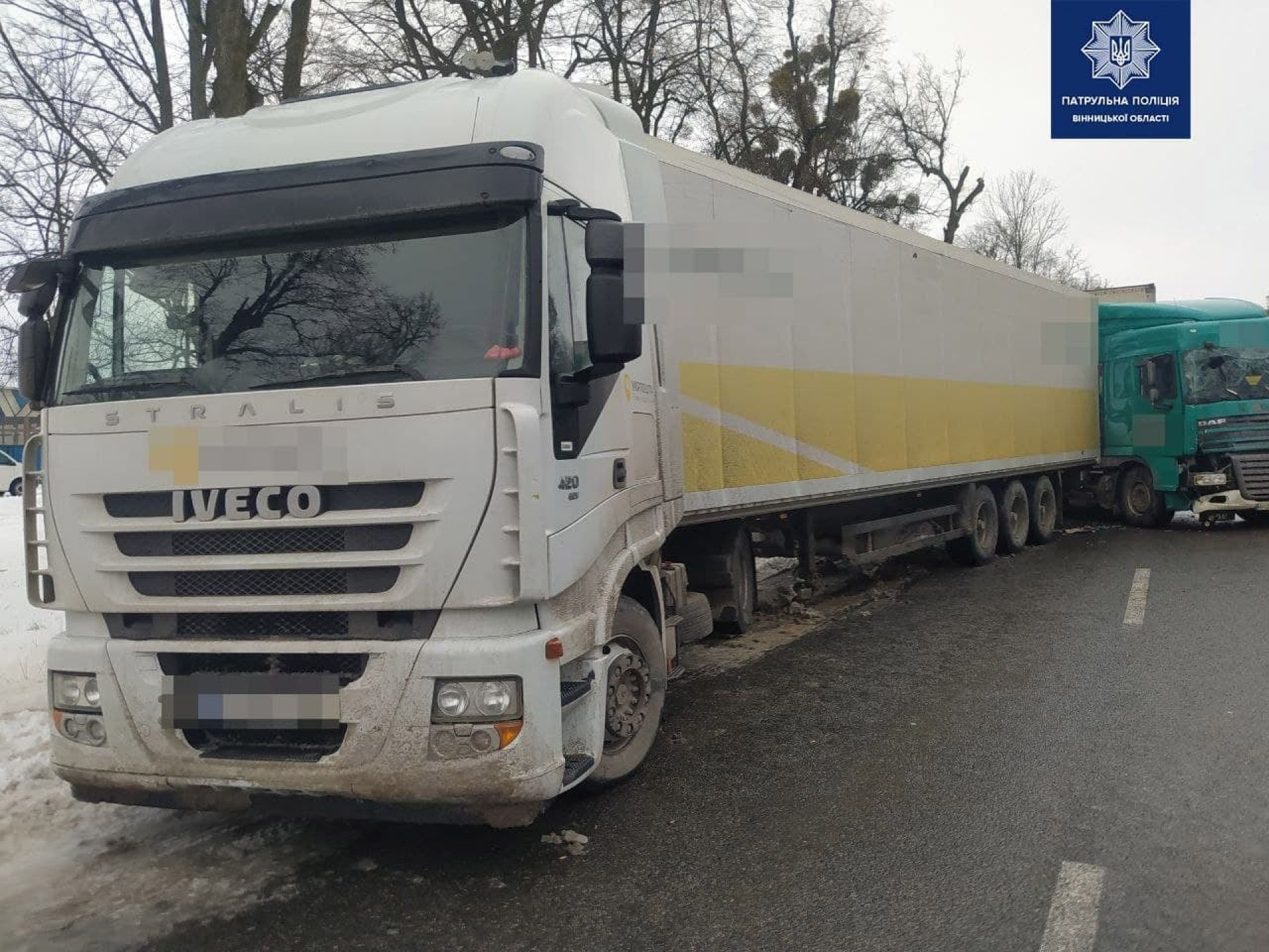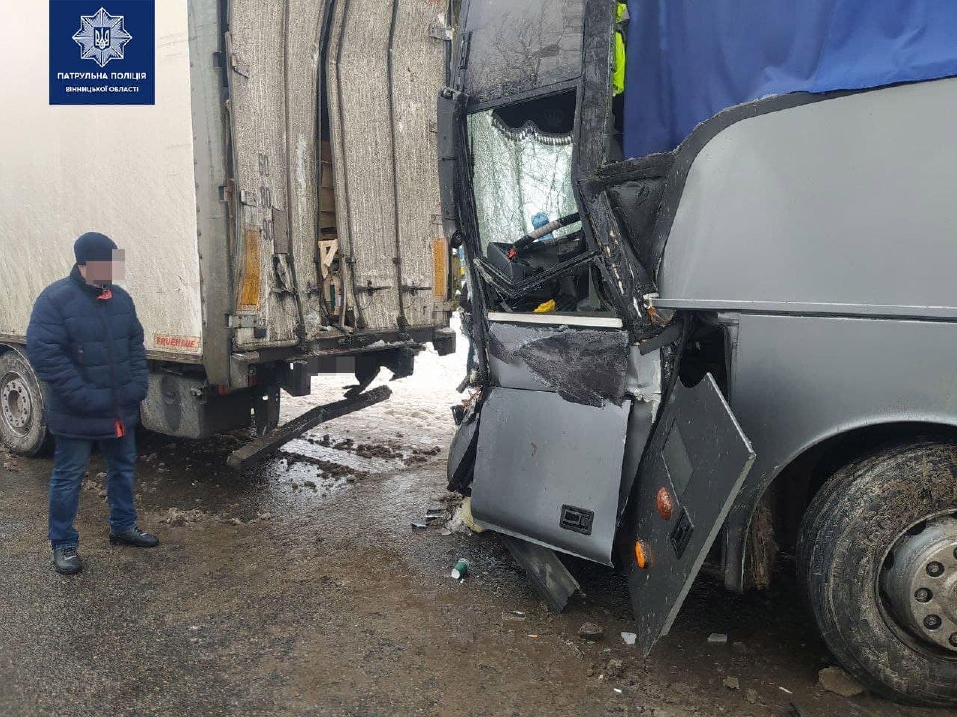 — Водій автобуса Van Hool, який надає послуги з перевезення пасажирів на міжнародному маршруті Херсон — Познань, рухаючись в напрямку Вінниці, в правій смузі для руху допустив бокове зіткнення з автомобілем Fiat, який рухався в попутному напрямку в лівій смузі для руху, — йдеться у повідомленні. — В подальшому автобус допустив бокове зіткнення з вантажним автомобілем Iveco, який був припаркований на узбіччі, та ще з одним автомобілем Skoda, який рухався в лівій смузі для руху в попутному напрямку. Після цього водій автобуса в правій смузі для руху допустив зіткнення з вантажним автомобілем Daf, який по інерції зіткнувся із ще одним вантажним автомобілем Iveco.