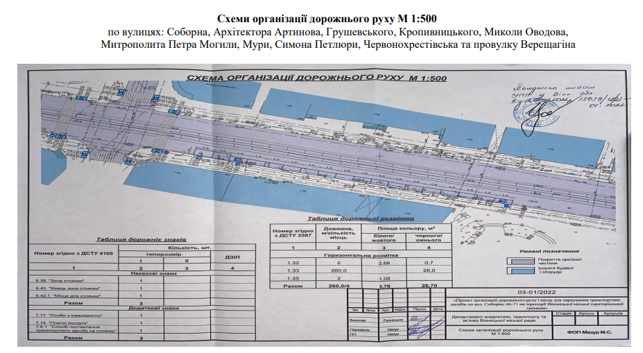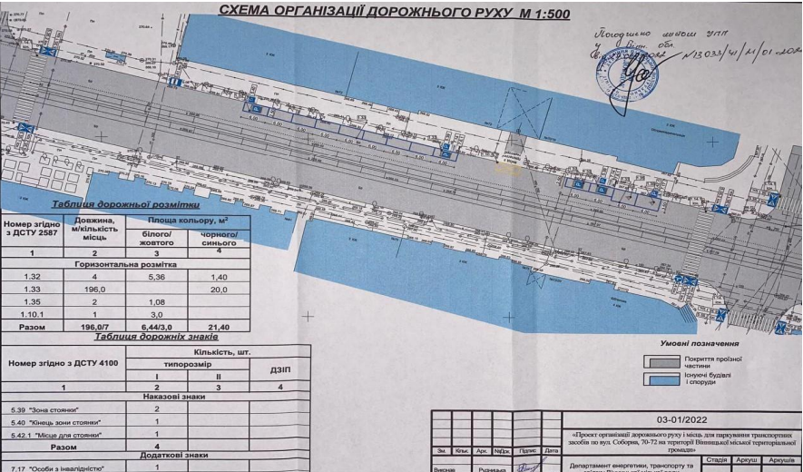 Виконком Вінницької міської ради затвердив перелік відведених місць для паркування транспортних засобів по вулицях: Соборна, Архітектора Артинова, Грушевського, Кропивницького, Миколи Оводова, Митрополита Петра Могили, Мури, Симона Петлюри, Червонохрестівська та провулку Верещагіна та схему організації дорожнього руху на зазначених вулицях.