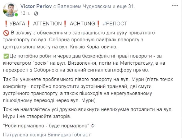 «Це потрібно робити через два безконфліктні праві повороти — за кінотеатром «росія» на вул. Визволення, потім на Магістратську, а на перехресті із Соборною на зелений сигнал світлофору прямо. Так ви уникнете проблемного лівого повороту на вул. Мури», — написав він у facebook.
