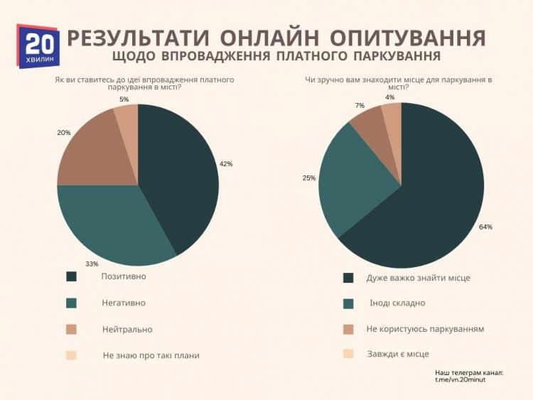 Разом із цим міськрада надала результати онлайн-опитування, проведеного на платформі E-DEM. Вінничан просили відповісти на низку запитань про те, наскільки зараз зручно знаходити місце для паркування, як вони ставляться до ідеї запровадження платної системи та за яких умов могли б її підтримати. Окремо учасників опитування просили визначити, які саме проблеми, на їхню думку, має вирішити платне паркування, і що для них є найважливішим у роботі такої системи — від тарифів до способів оплати чи зонування.