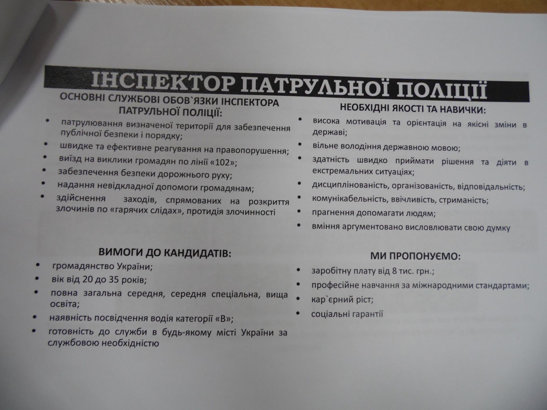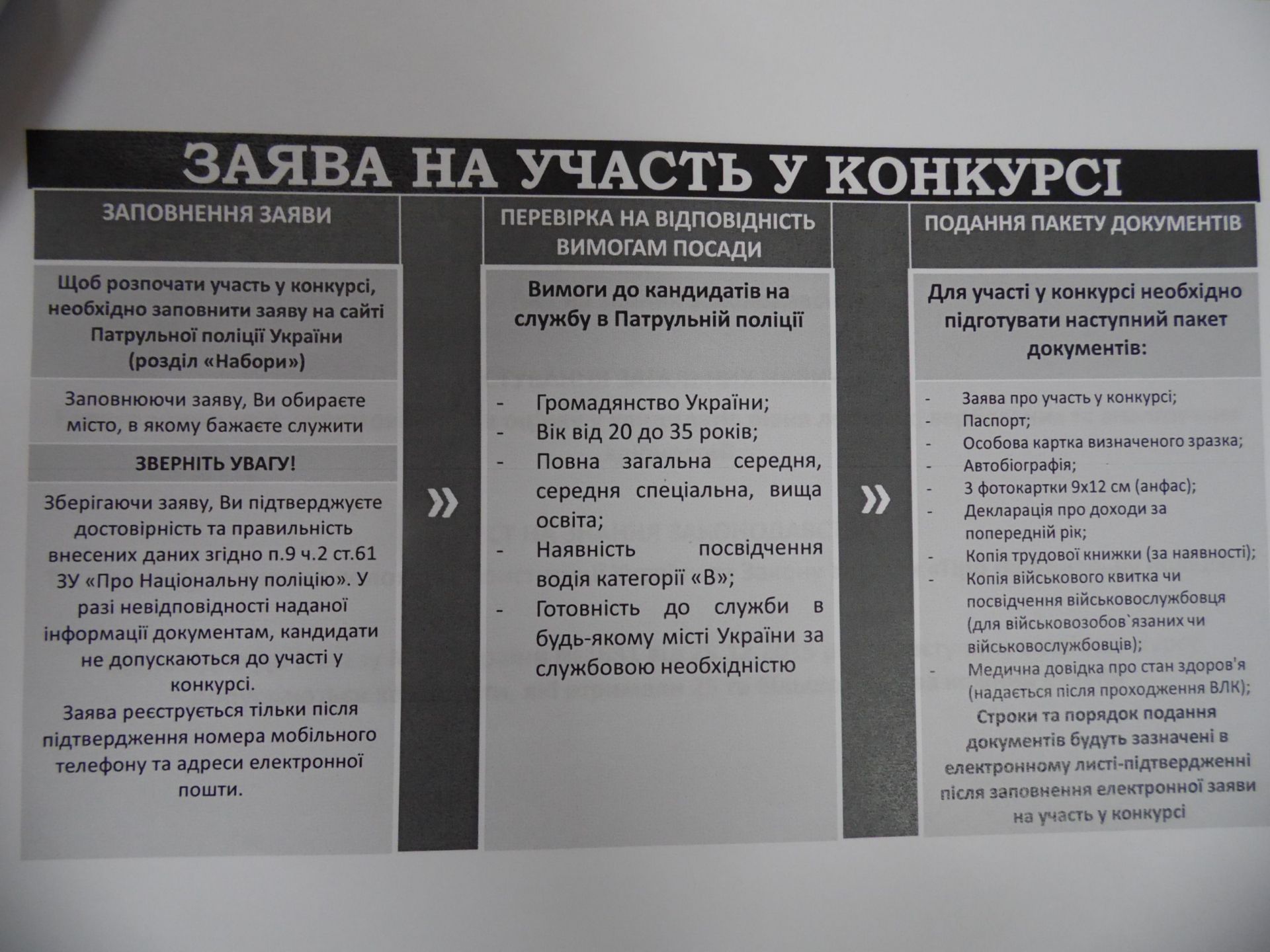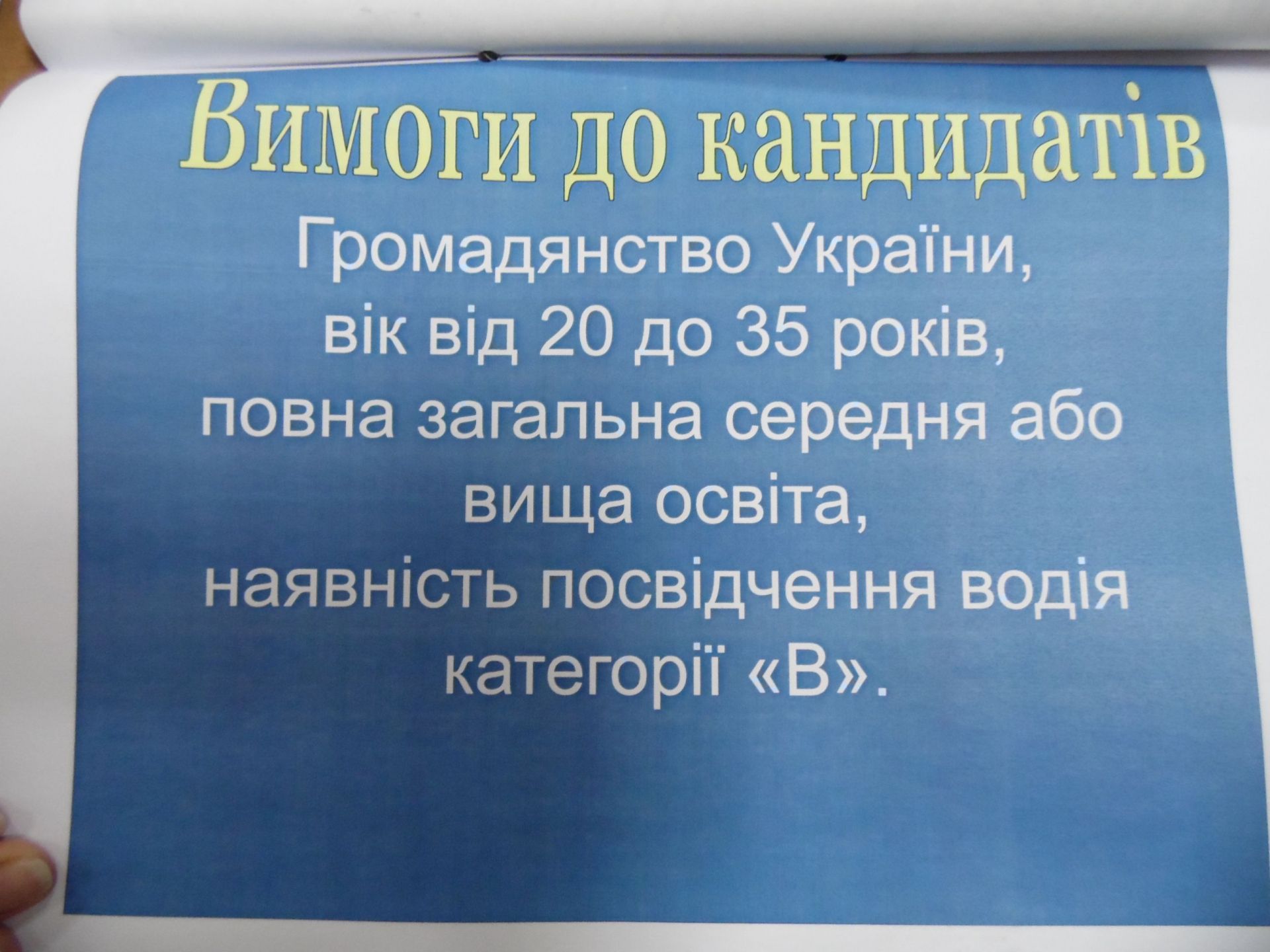 Вимоги до кандидатів стандартні для поліції: громадянство України, повна середня або вища освіта, вік від 20 до 35 років і фізична підготовка. Зарплату обіцяють від 8 тисяч гривень за готовність працювати по 12 годин на добу, інколи без вихідних та часто їздити у відрядження.