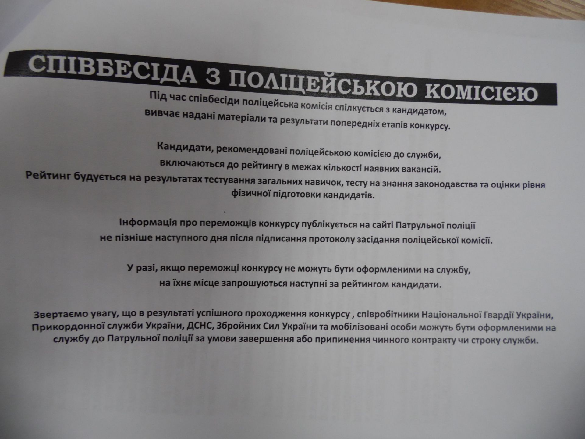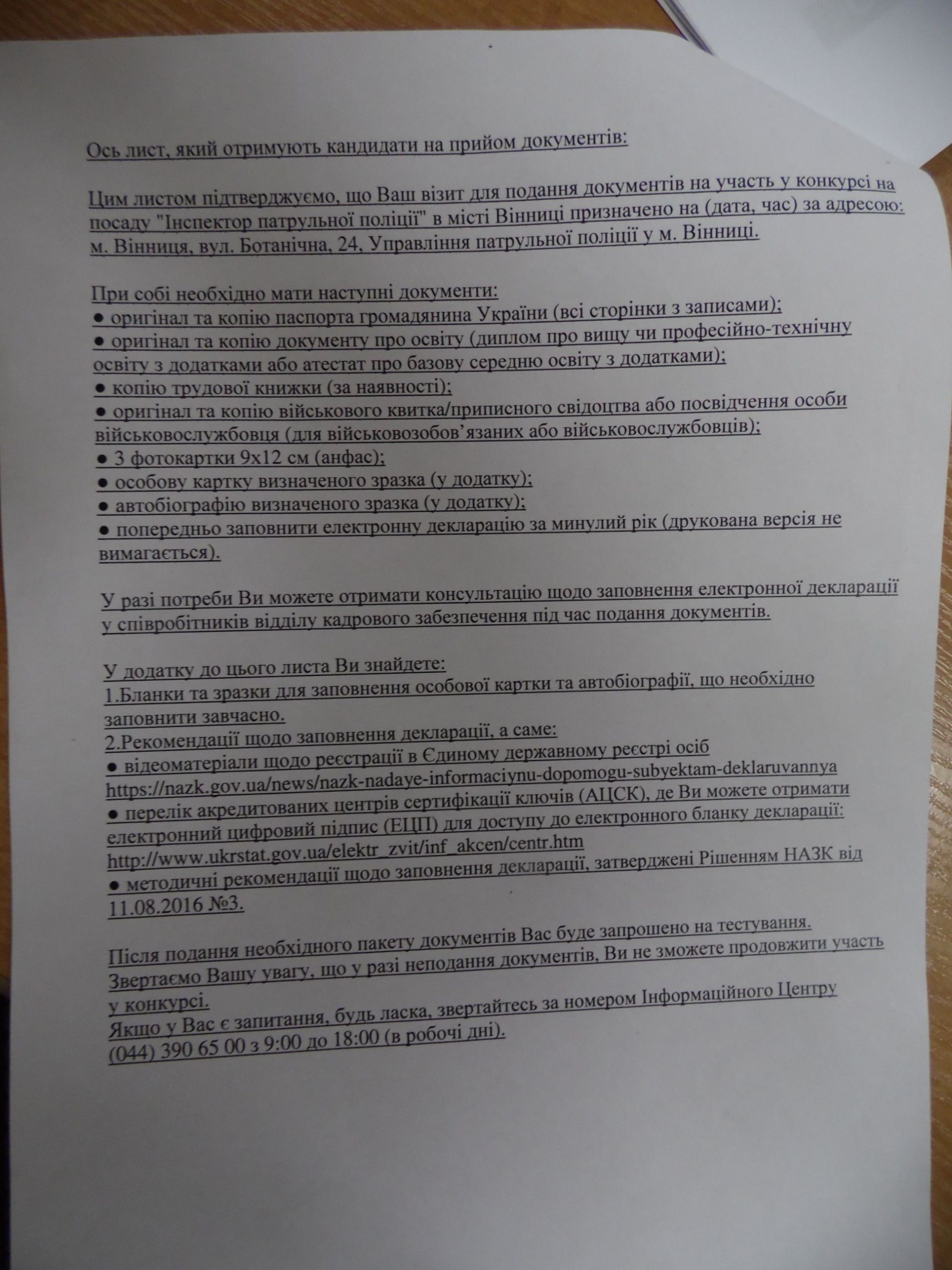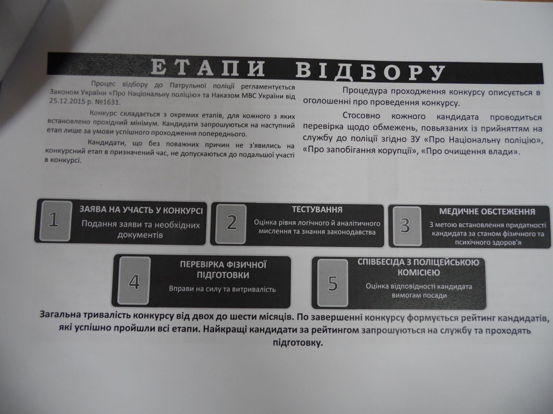 Анкети бажаючих взяти участь у конкурсі почали приймати сьогодні, 11 липня. Звершиться прийом документів 30 липня. Далі на кандидатів чекає конкурсний відбір у п’ять етапів, який завершиться співбесідою із комісією. У комісії працюватимуть п’ятеро людей – по двоє представників від громадськості та поліції і один представник внутрішньої безпеки.