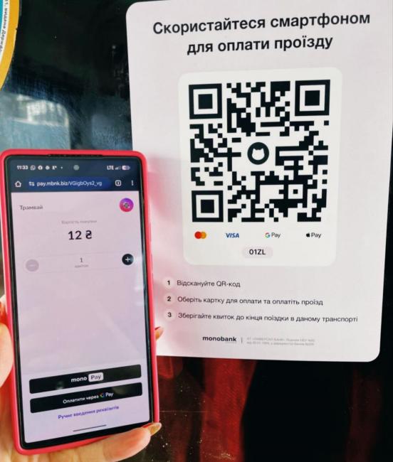 У Вінницькій транспортній компанії повідомили, що в салонах транспорту почали впроваджувати QR-коди від monobank рожевого кольору, які дозволяють оплатити поїздку не лише через банківські застосунки, а й за допомогою Google Pay, Apple Pay або звичайної банківської картки.