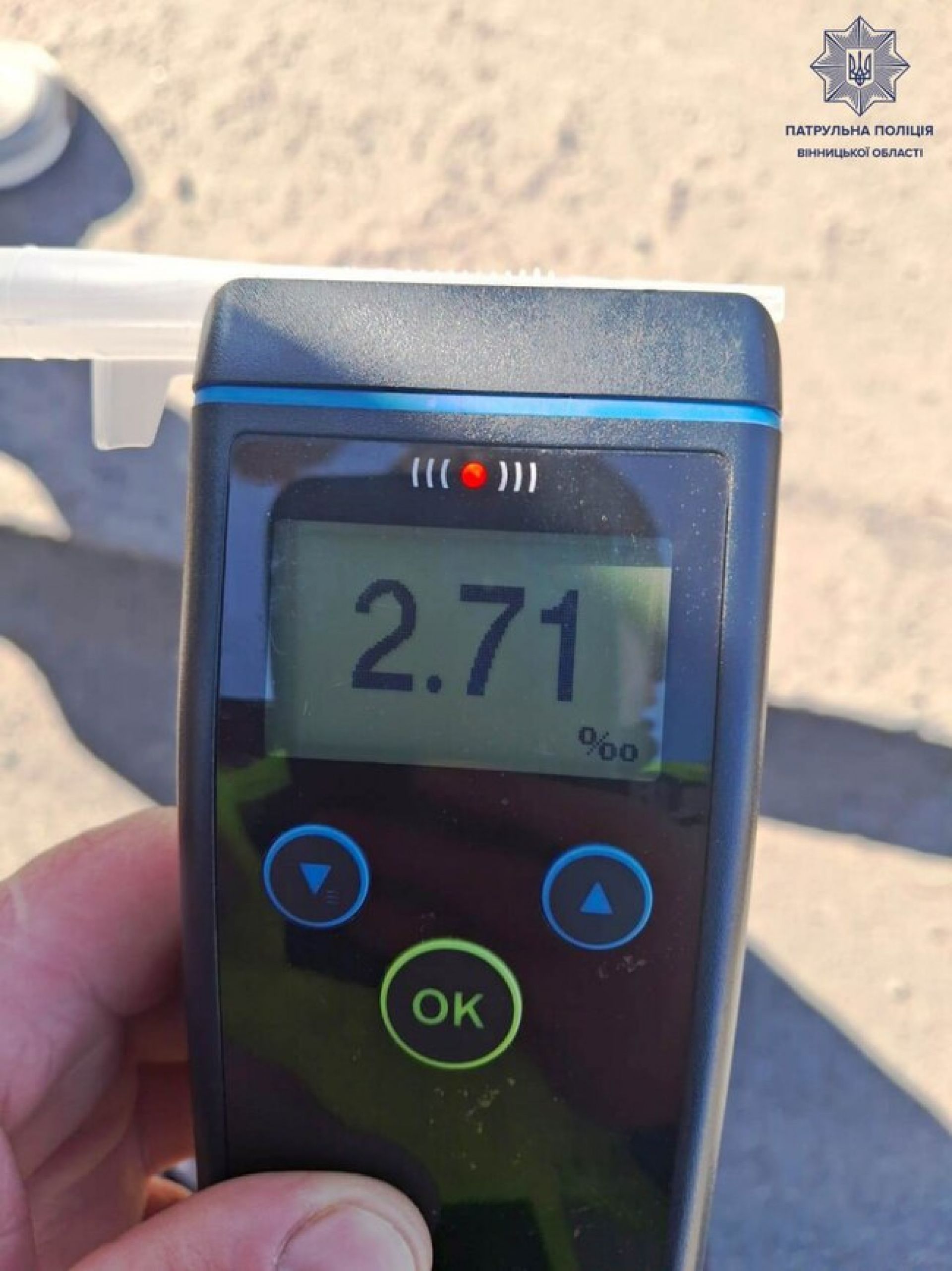 — Спілкуючись із порушником патрульні помітили у винуватця ДТП ознаки алкогольного сп'яніння. Чоловік погодився пройти перевірку на спецприладі Драгер. Результат огляду — 2,71 проміле алкоголю, що майже в 14 разів перевищує допустиму норму, — йдеться у повідомленні.