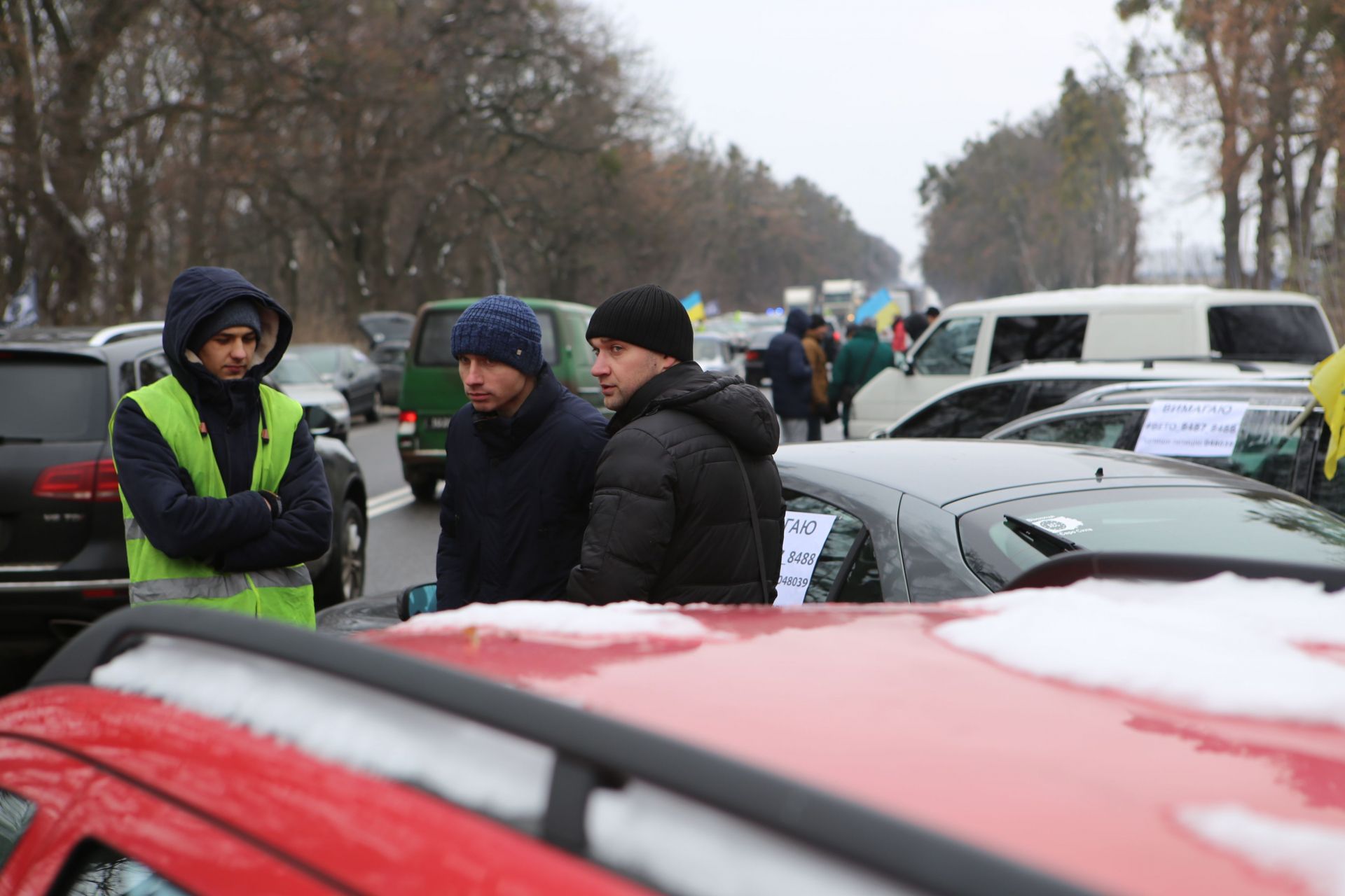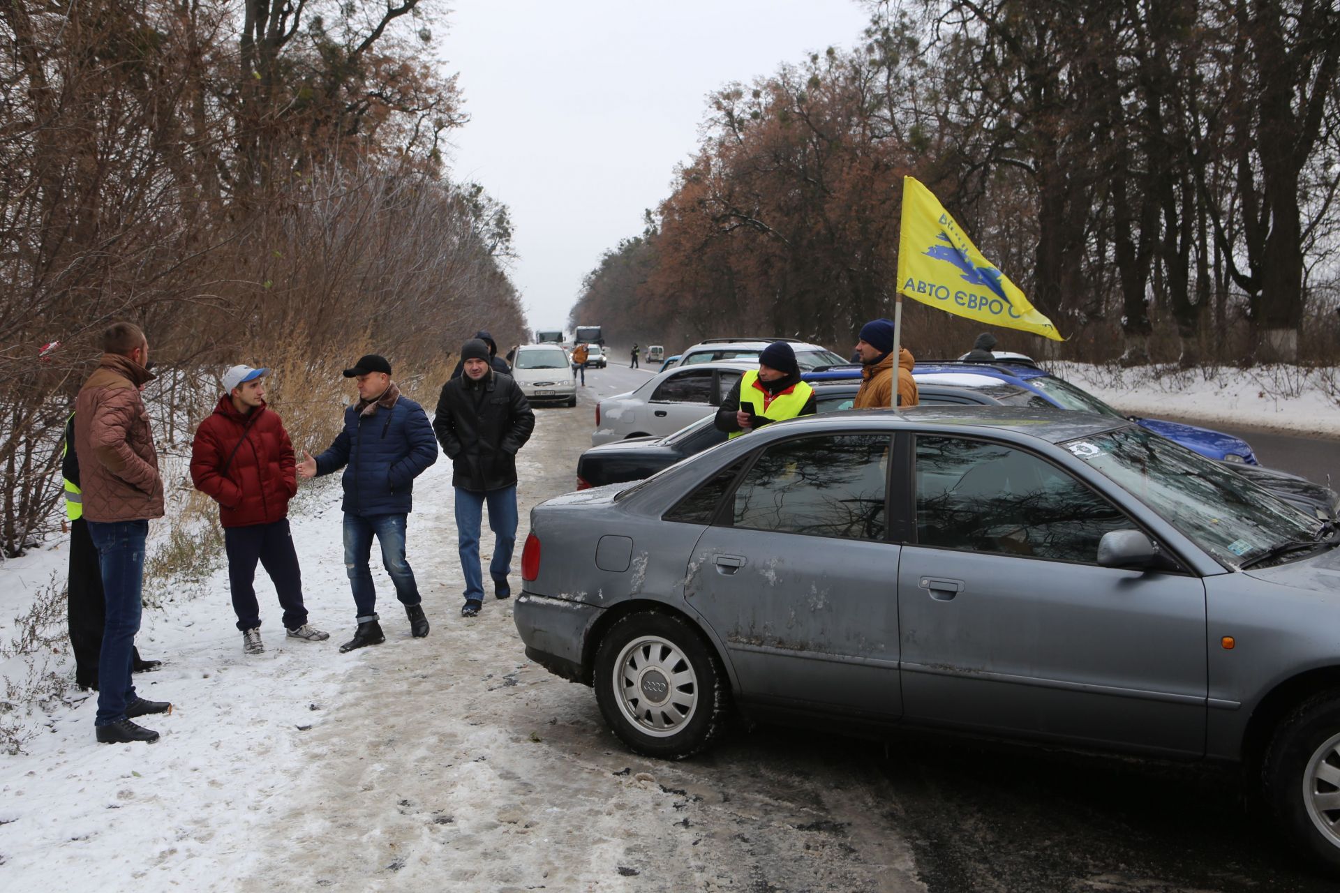 Там кілька десятків водіїв «євроблях» поставили свої машини з двох сторін уздовж дороги, таким чином звузивши проїжджу частину. Рух ускладений, але не перекритий. На місці працюють патрульні поліцейські, які організували реверсний рух. Поки проїжджає колона автівок з однієї сторони — водії з іншої чекають.