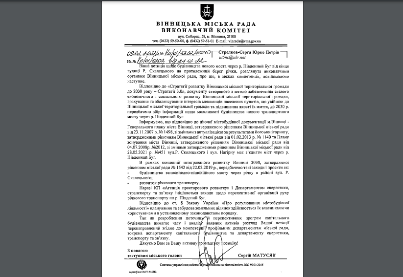 У відповіді із підписом заступника міського голови Сергія Матусяка йдеться, що до 2030 року будуть збирати інформацію щодо можливості будівництва нового транспорту мосту через річку Південний Буг. Це передбачено Стратегією розвитку Вінниці 3.0.