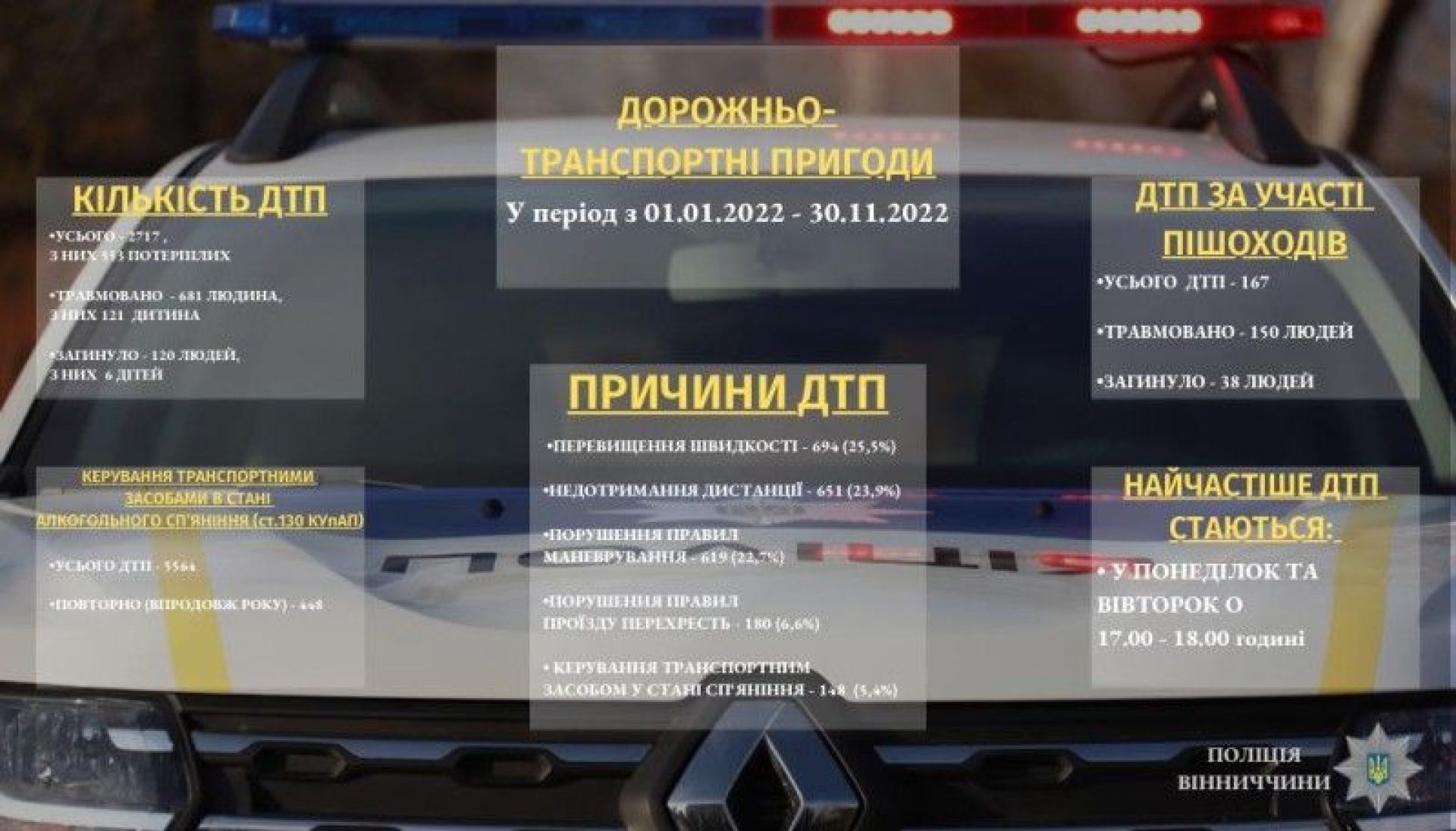 - За інформацією управління превентивної діяльності ГУНП області, за 11 місяців поточного року на автошляхах регіону сталась 2717 дорожньо-транспортних пригод, з яких 553 — з потерпілими. У цих автопригодах травмувались 681 людина та 120 загинули.