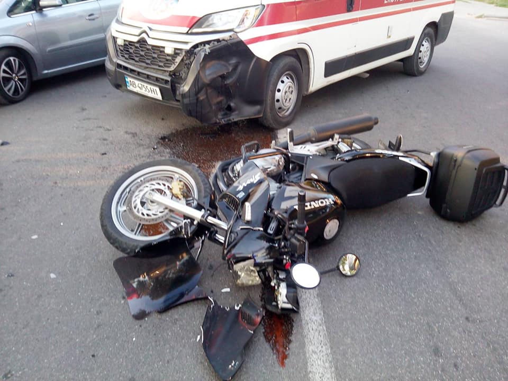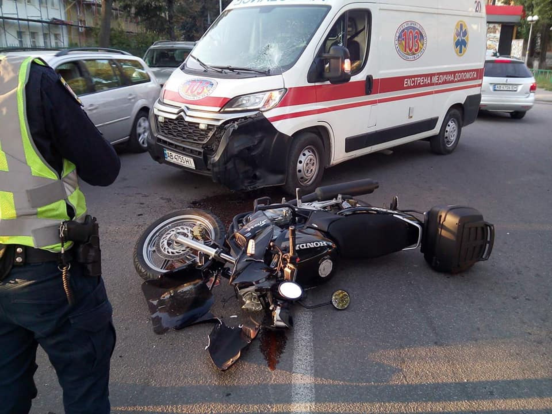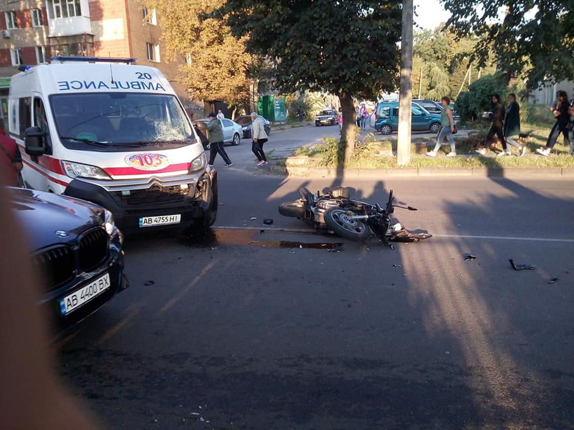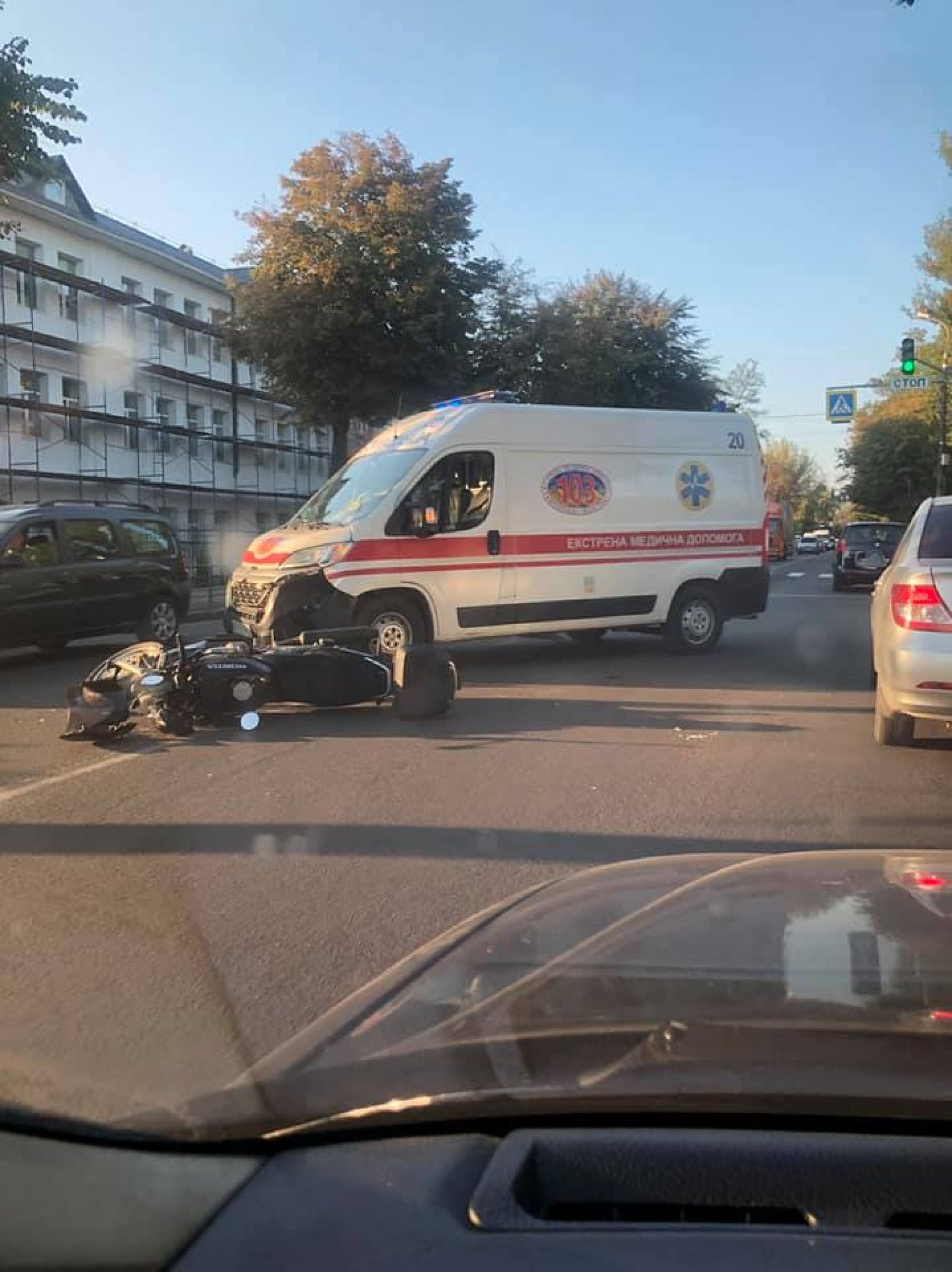 Інформація про аварію на вулиці Максима Шимка надійшла в редакцію 20minut.ua близько 19.00 8 вересня. За словами очевидців ДТП за участю мотоцикла та машини швидкої допомоги, байкер врізався у швидку під час руху головною дорогою, а водій швидкої виїжджав з провулка.