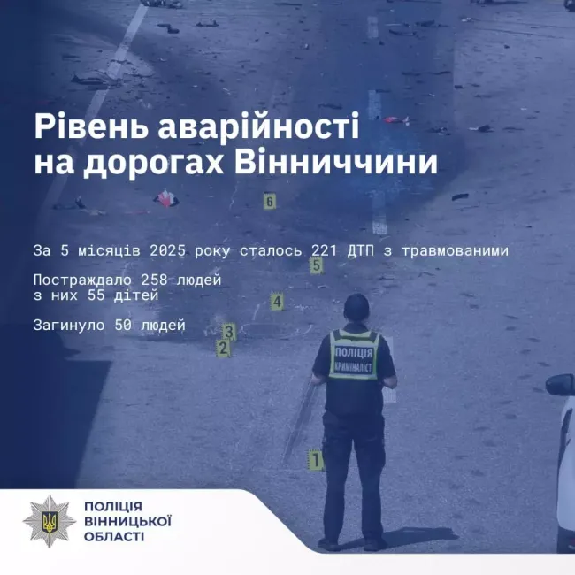 Нагадаємо, у січні-травні 2025 року на дорогах Вінницької області зафіксували 1 552 аварії, 221 з яких із потерпілими. Внаслідок ДТП постраждали 258 людей, загинуло 50. Основні причини аварій — недотримання дистанції, перевищення швидкості, порушення правил маневрування та керування в стані сп’яніння.