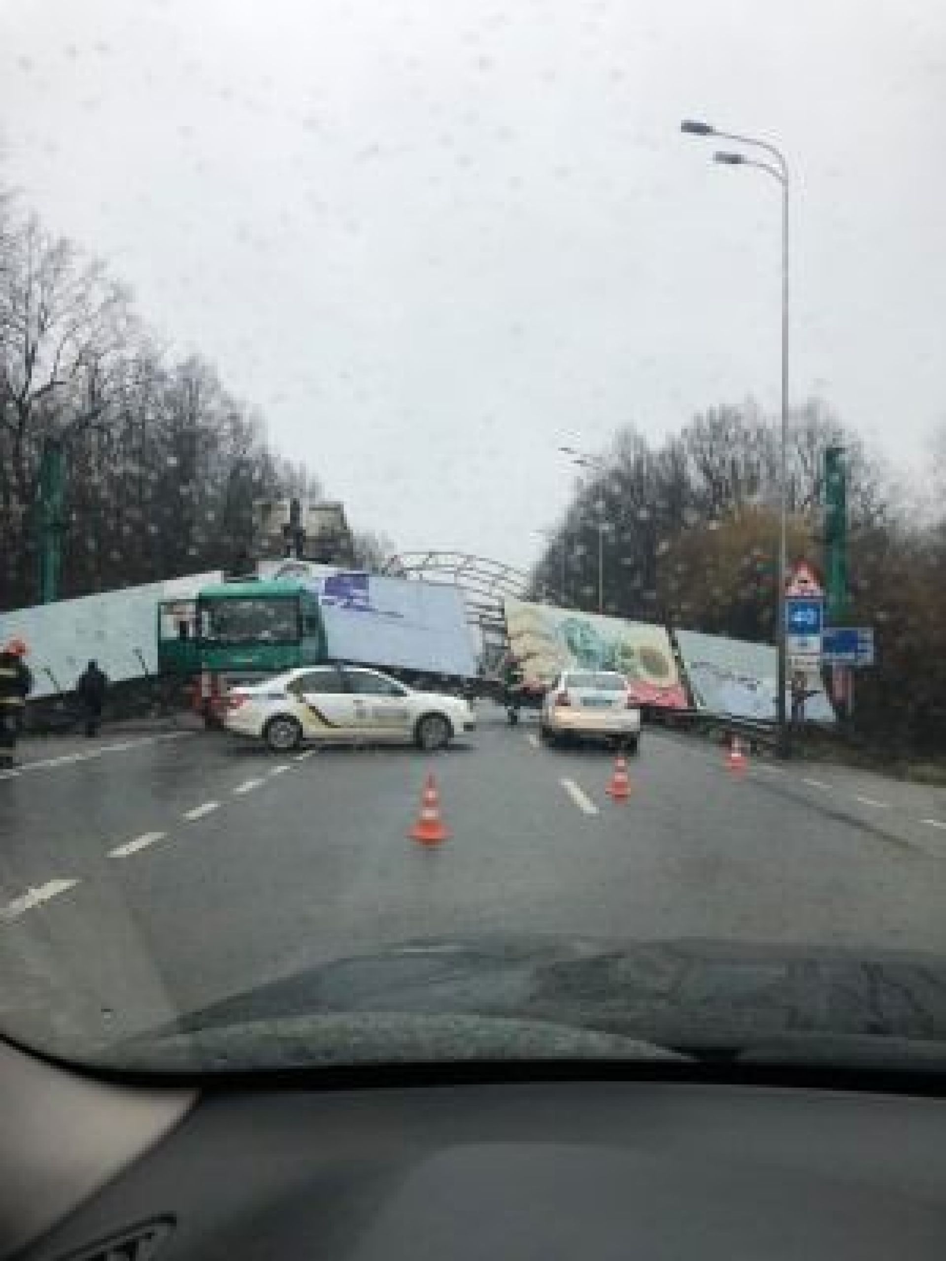 Невдовзі в мережі з’явилася інформація про ДТП біля західного автокзалу — там фура збила рекламний щит, який висів над дорогою. Рух з обох сторін заправки БРСМ, де й сталася аварії, перекрили на кілька годин. Як повідомили дорожні служби, до 20.00 рух відновлять.