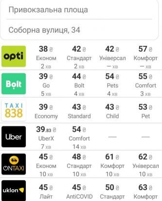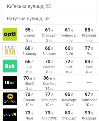 До речі, не завжди водії Opti пропонують найнижчі ціни, а Uklon найвишчі. Наприклад, від МакДональдса на Вишеньці до МакДональдса на Соборній найкраща пропозиція ще й від таксі 838 — 52 гривні, але Opti також 52. Поїздка на OnTaxi для любителів фастфуда обійдеться в 61 гривню, Uklon — 62, Uber — 63,36, а Bolt — 69.
