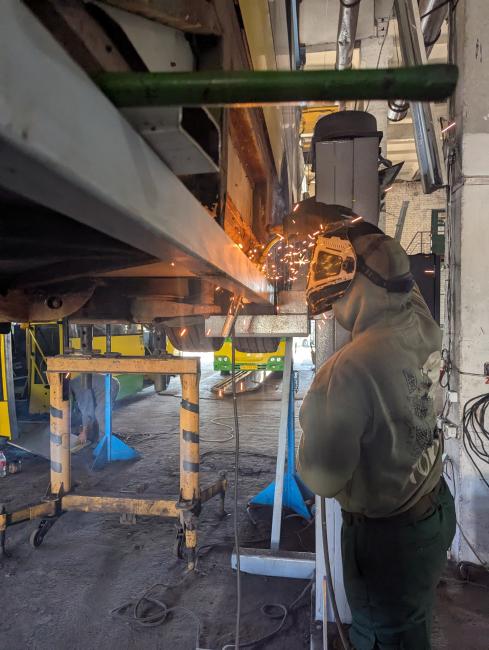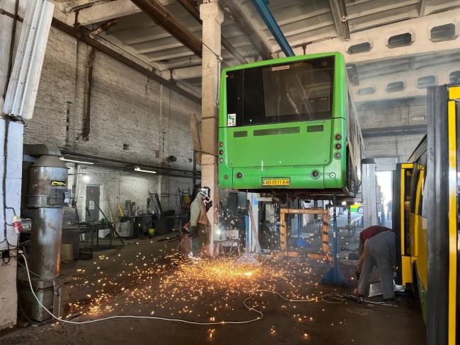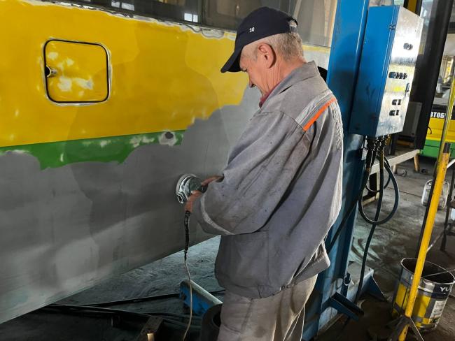 У цеху автобусного парку зараз чути гул обладнання — майстри ремонтують два автобуси. Один проходить повний капітально-відновлювальний ремонт, а другий — кузовне відновлення, яке інколи називають «аварійним ремонтом». Таке втручання проводять через критичний стан кузова. Як розповіли у міськраді, ремонт виконують власними силами працівники автобусного депо.