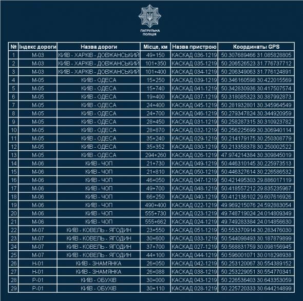 Встановлення стаціонарних технічних засобів (приладів контролю) буде здійснюватись на аварійно-небезпечних місцях (ділянках) та місцях концентрації дорожньо-транспортних пригод автомобільних доріг загального користування державного та місцевого значення вулиць і доріг у містах та інших населених пунктах за погодженням із відповідним уповноваженим підрозділом Національної поліції.