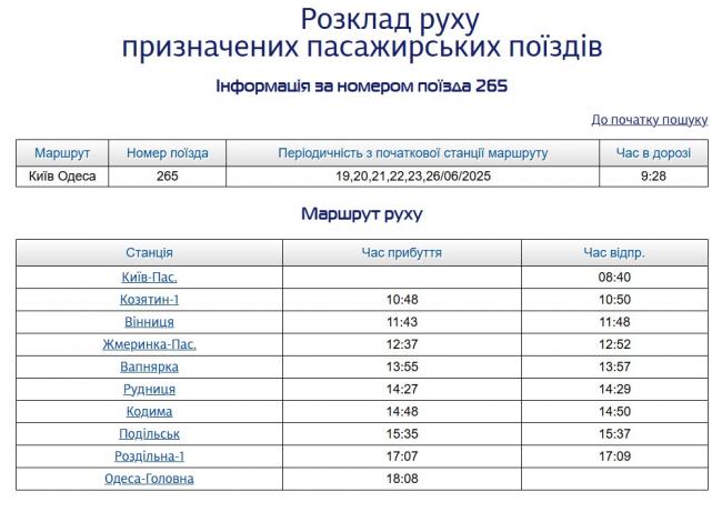 Зокрема, на 27, 28, 29 та 30 червня заплановано курсування поїзда № 265/266 за маршрутом Київ — Одеса — Київ. Цей потяг зупинятиметься на кількох важливих станціях Вінниччини — у Козятині, Вінниці, Жмеринці та Вапнярці.