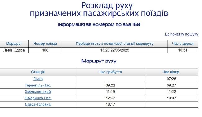 Крім того, призначили додаткові рейси поїзда № 168/167 Львів — Одеса на 27 і 29 червня, а також на 4, 6, 11, 13, 18 та 20 липня. Цей поїзд зупинятиметься у Жмеринці, що робить його зручним варіантом для мешканців та гостей регіону.