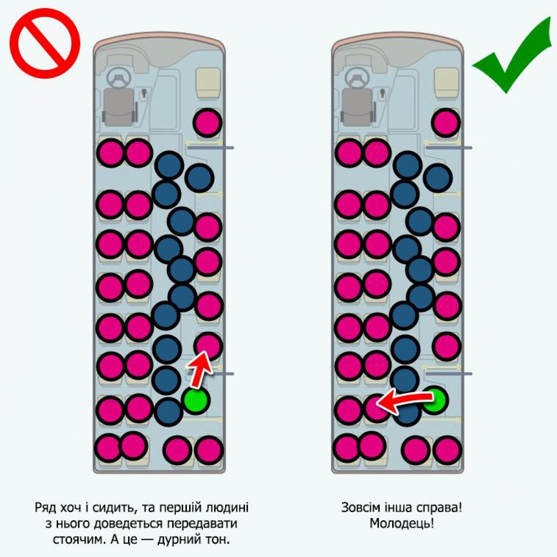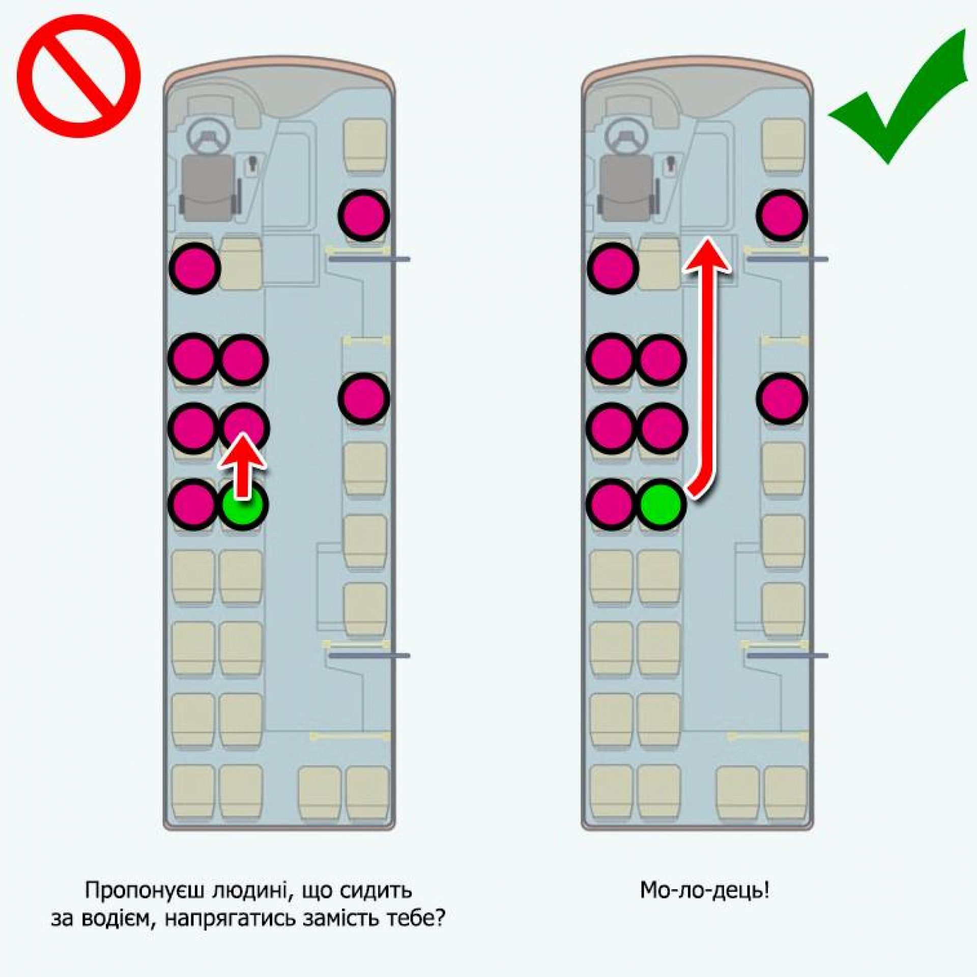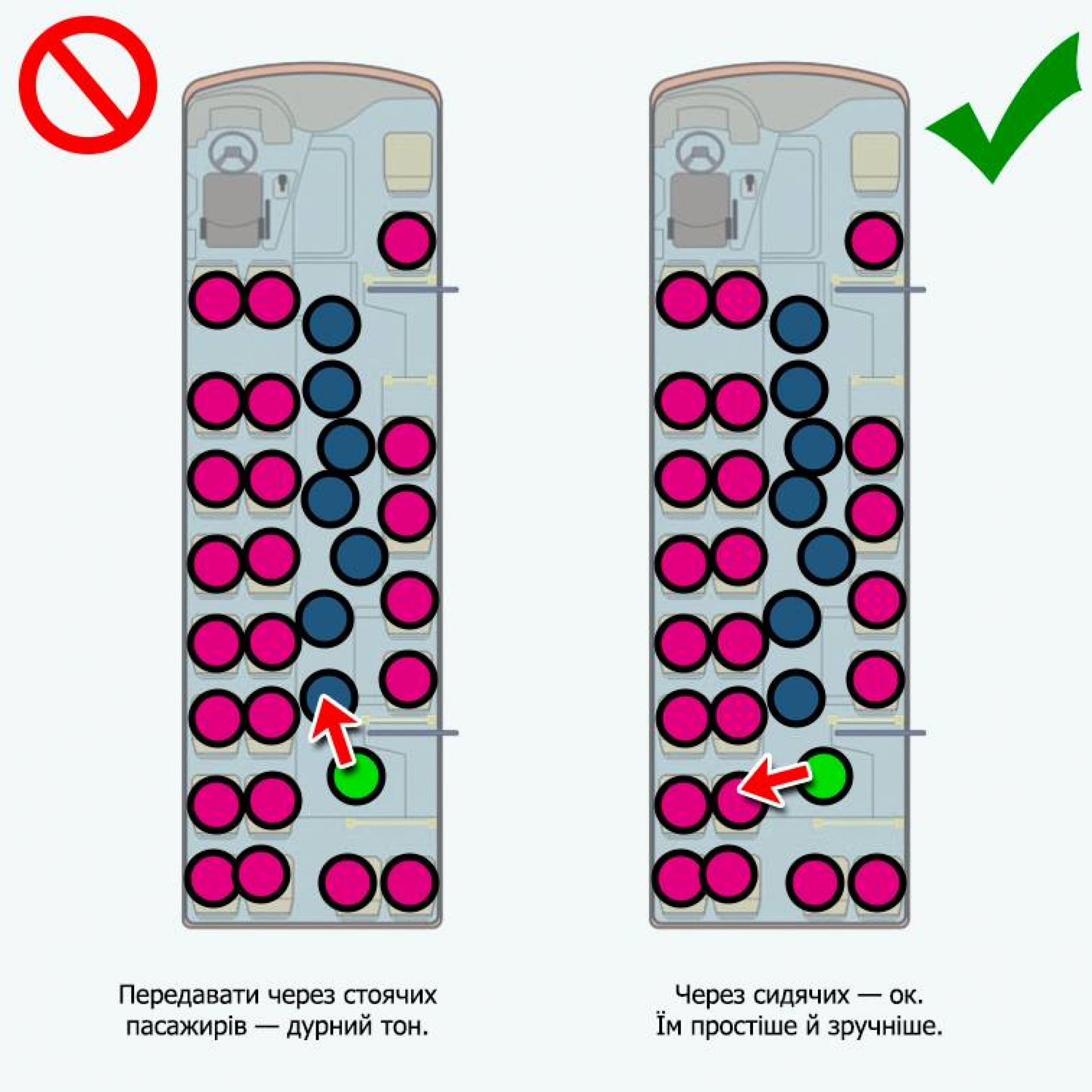 Схеми розроблені в залежності від положення «того, що дає за проїзд» й різного ступеня наповнення маршрутки.