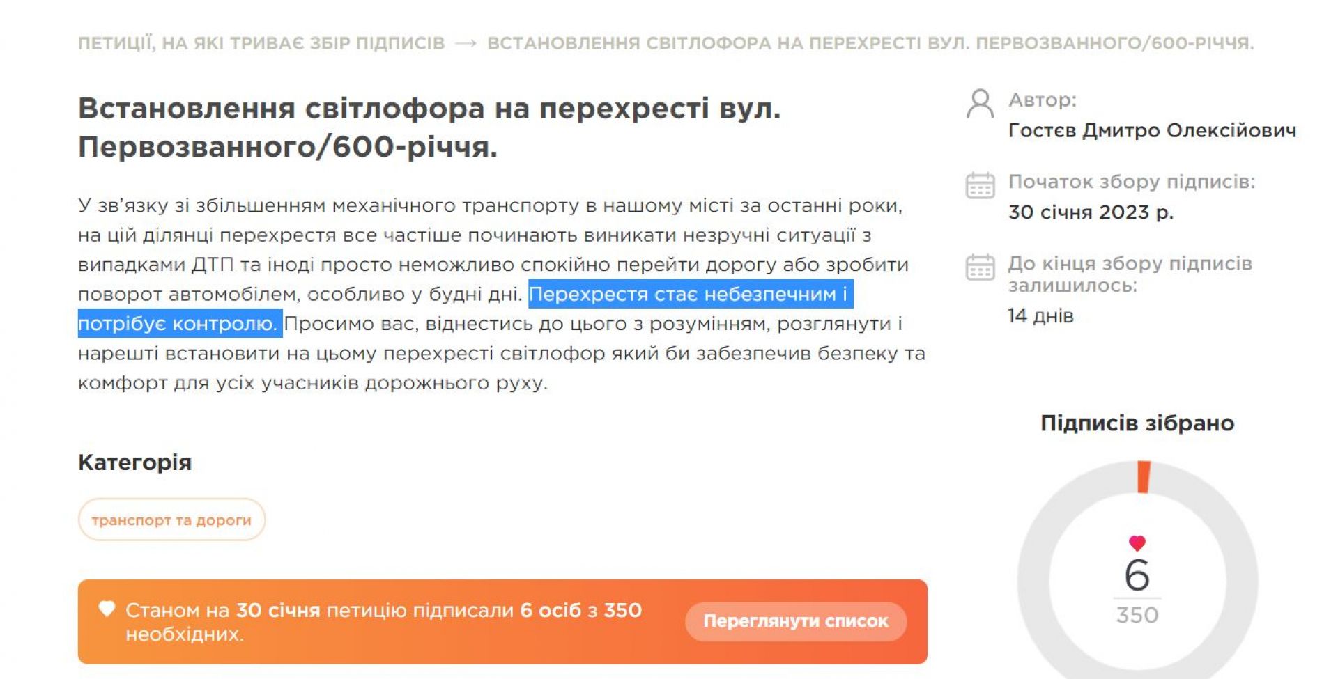 - За словами автора петиції, перехрестя на вулиці Первозванного стає небезпечним і потребує контролю.
