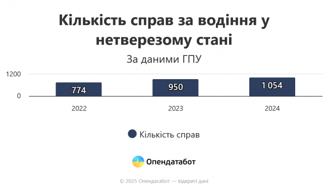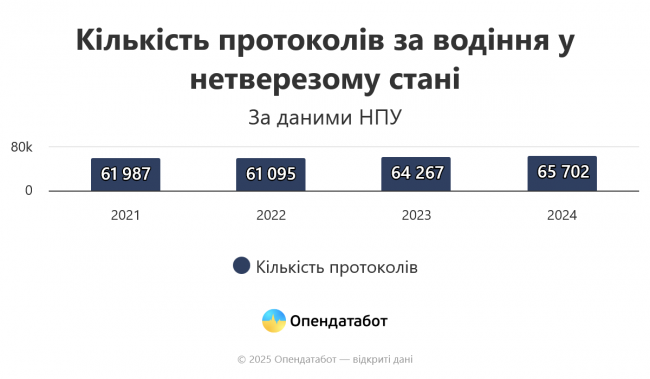 У 2024-му Національна поліція України зафіксувала понад 65 тисяч протоколів за водіння у нетверезому стані. Також Генеральна прокуратура відкрила понад тисячу кримінальних проваджень за керування автомобілем під впливом алкоголю чи наркотиків. П’яні водії спричинили кожну 25-ту ДТП з постраждалими. Така невтішна статистика за даними Опендатабот.