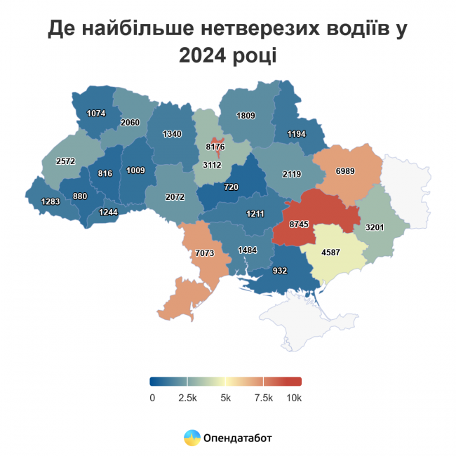 Найбільше нетверезих водіїв зафіксували на Дніпропетровщині — 8 745 протоколів. До трійки антилідерів потрапив також Київ — 8 176 протоколів та Одещина — 7 073 протоколи. На Вінниччині цей показник склав 2 072 протоколи.