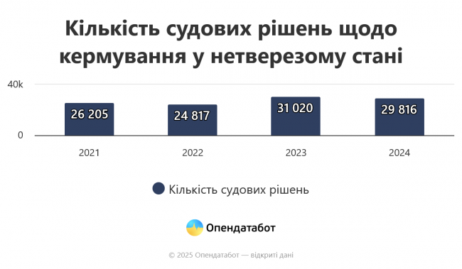 Кількість судових рішень про керування транспортними засобами у стані алкогольного, наркотичного чи іншого сп’яніння у 2024 році склала 29 816. Це на 14% більше, ніж до початку повномасштабної.