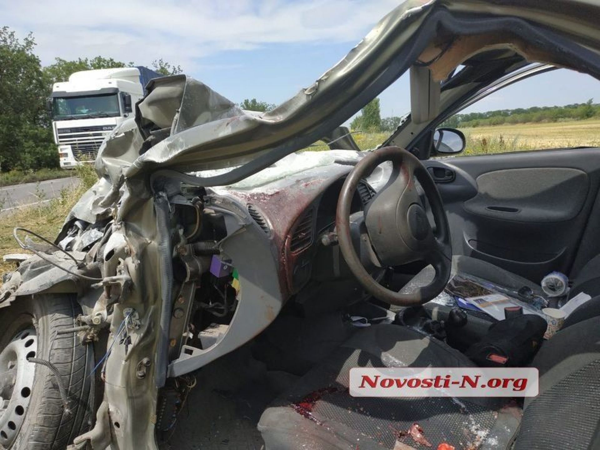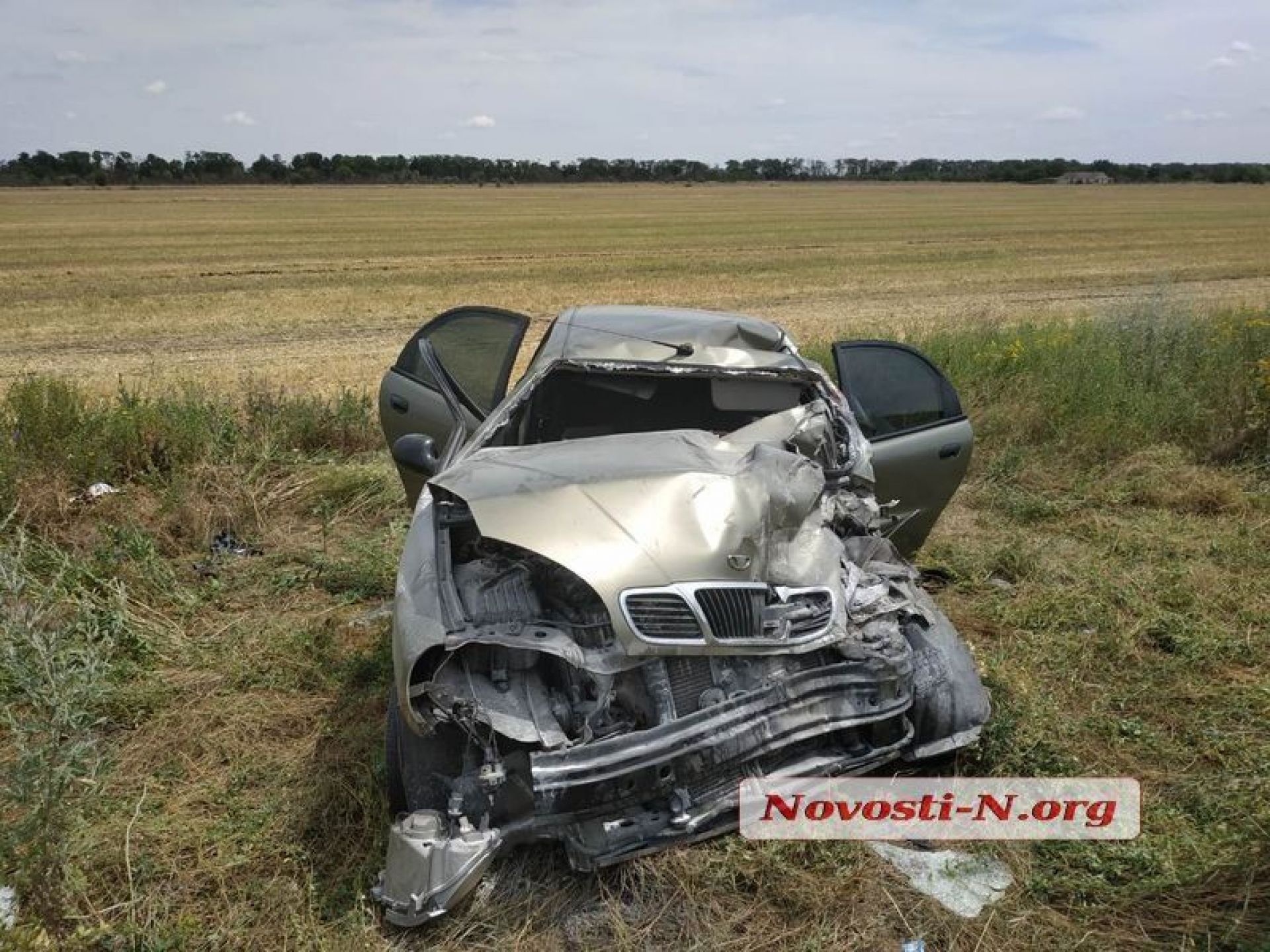 Як повідомляє місцевий сайт «Новости Н», «Ланос» їхав по трасі з боку Херсона в напрямку села Мішково-Погорілове. В районі повороту на село Водник водій спробував об'їхати ями на дорозі і виїхав на зустрічну смугу, по якій в цей час рухався зерновоз. Водій зерновозу намагався піти від зіткнення, виїхавши правими колесами на узбіччя, проте «Ланос» на повному ходу врізався в «Мерседес».