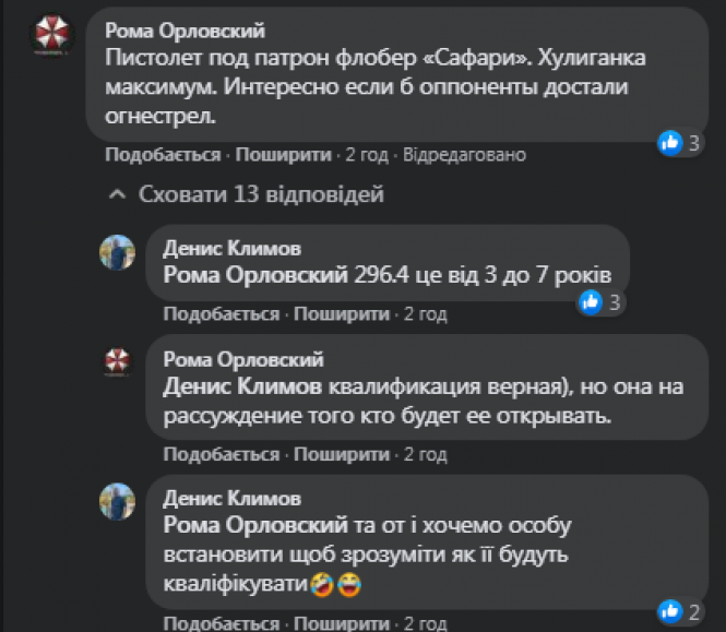 Під цим дописом містяни почали залишати коментарі, в одному з яких Рома Орловський написав, що це був пістолет під патрон флобер «Сафарі».