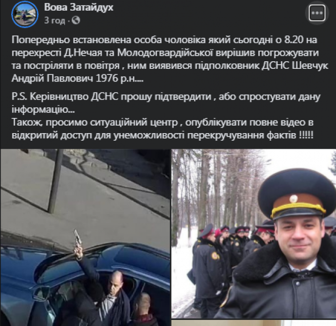 «Попередньо встановлена особа чоловіка, який сьогодні о 8.20 на перехресті Д.Нечая та Молодогвардійської вирішив погрожувати та постріляти в повітря, ним виявився підполковник ДСНС Шевчук Андрій Павлович 1976 року народження, — написав Голова ГО «Дорожній контроль» Володимир Затайдух. — P.S. Керівництво ДСНС прошу підтвердити, або спростувати дану інформацію. Також просимо ситуаційний центр опублікувати повне відео в відкритий доступ для унеможливлення перекручування фактів».