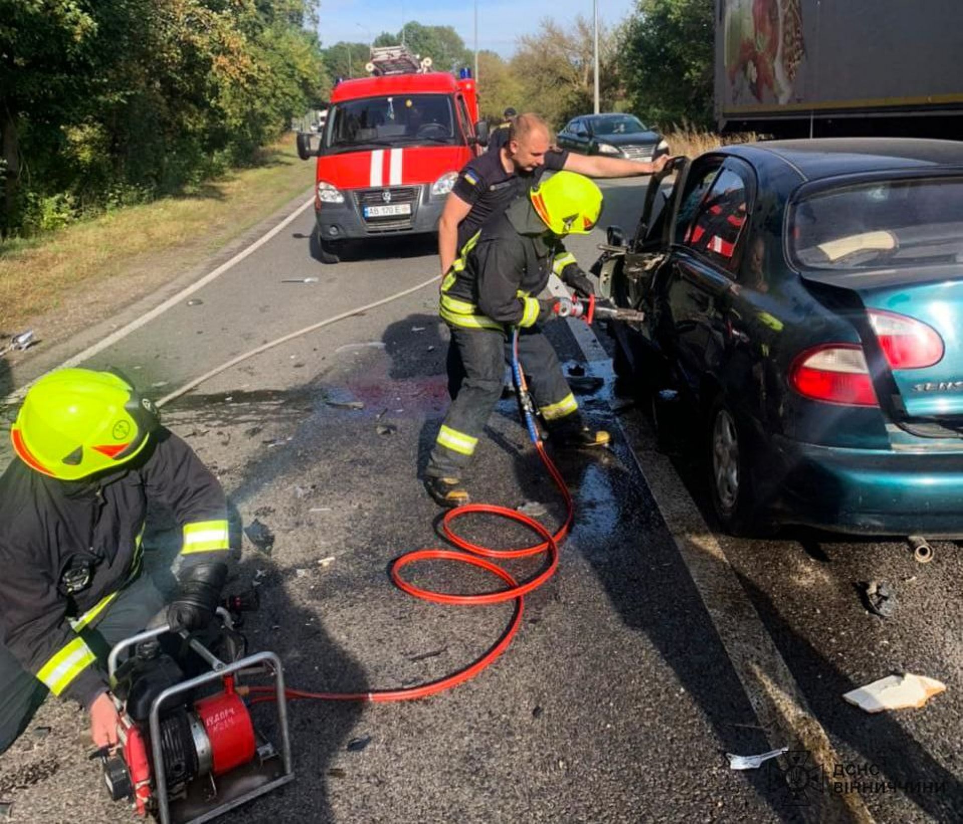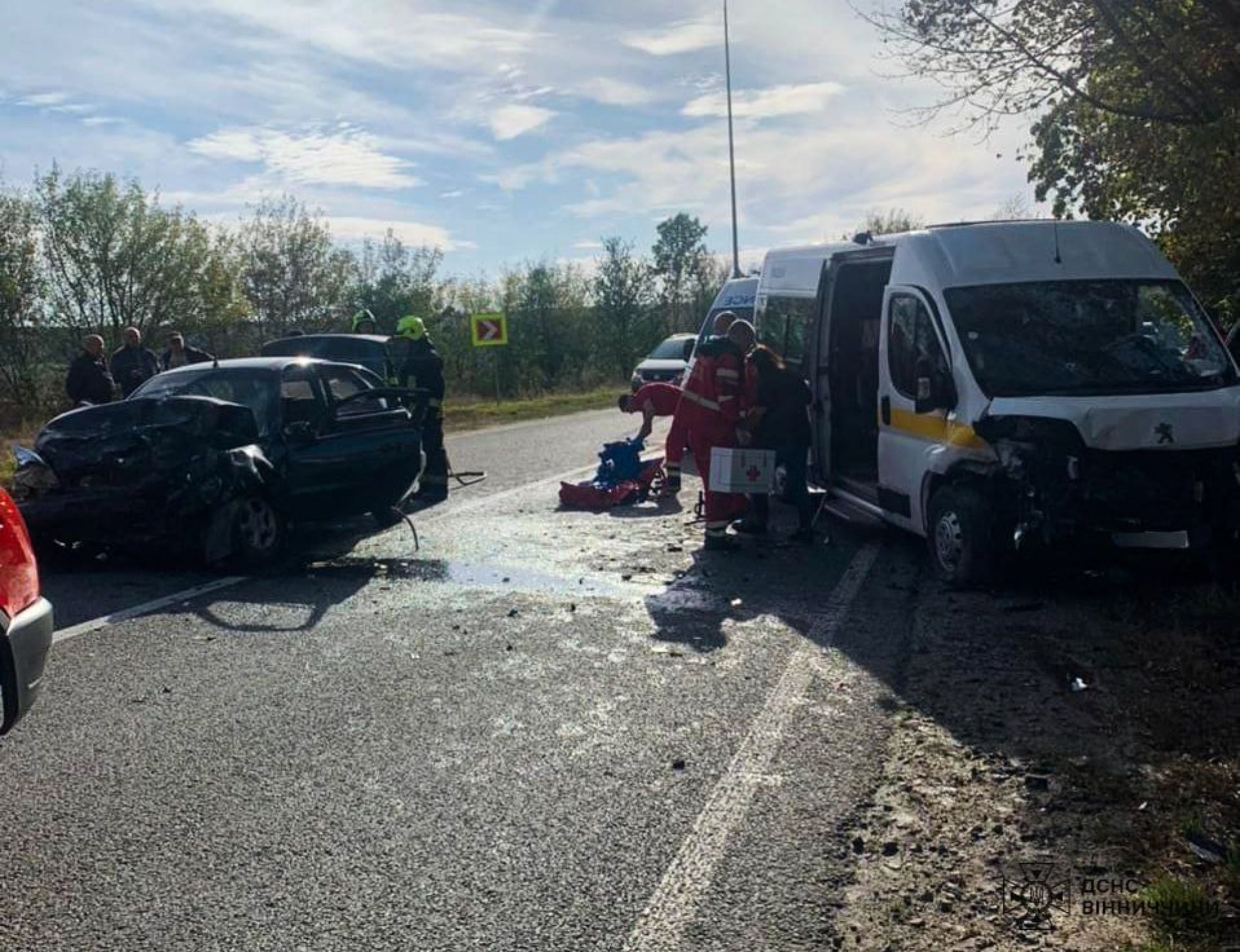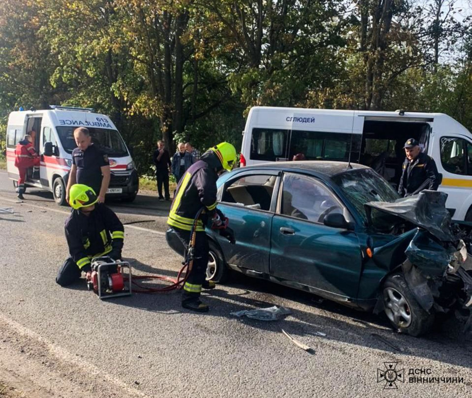 Внаслідок зіткнення двох автомобілів — легковика «Део Сенс» та мікроавтобуса «Пежо» — у салонах автомобілів затисло людей. Про це інформує Головне управління ДСНС України у Вінницькій області.