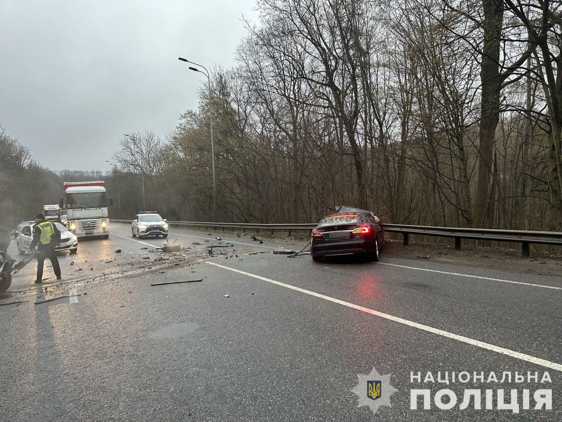 — Попередньо встановлено, що відбулось зіткнення між автомобілями Tesla та Honda. Внаслідок аварії пасажир Honda отримав травми несумісні з життям. Водії легковиків були госпіталізовані, — зазначають у поліції.