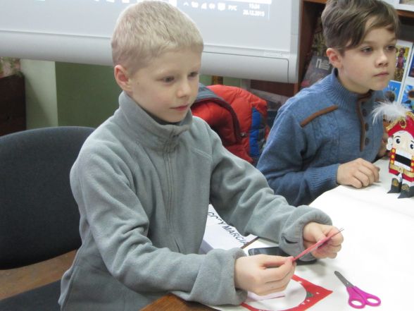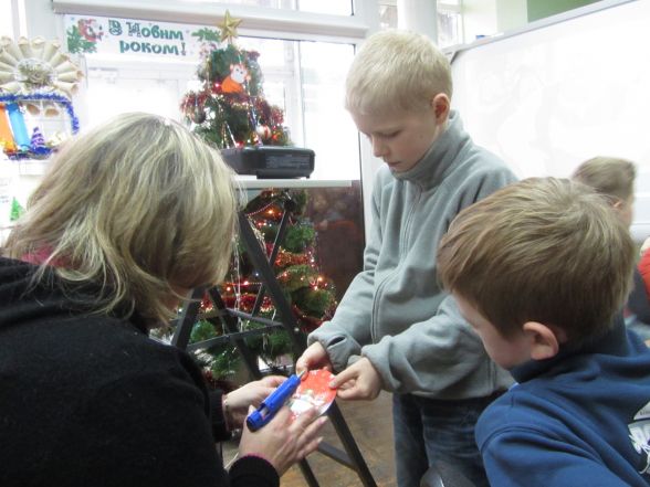 Бібліотекар Тетяна Мазур проводить майстер-клас та показує, як з використаного диску можна зробити новорічний сувенір. Діти вирізають деталі, бібліотекарка допомагає склеювати все гарячим клейовим пістолетом, щоб діти не попеклись.