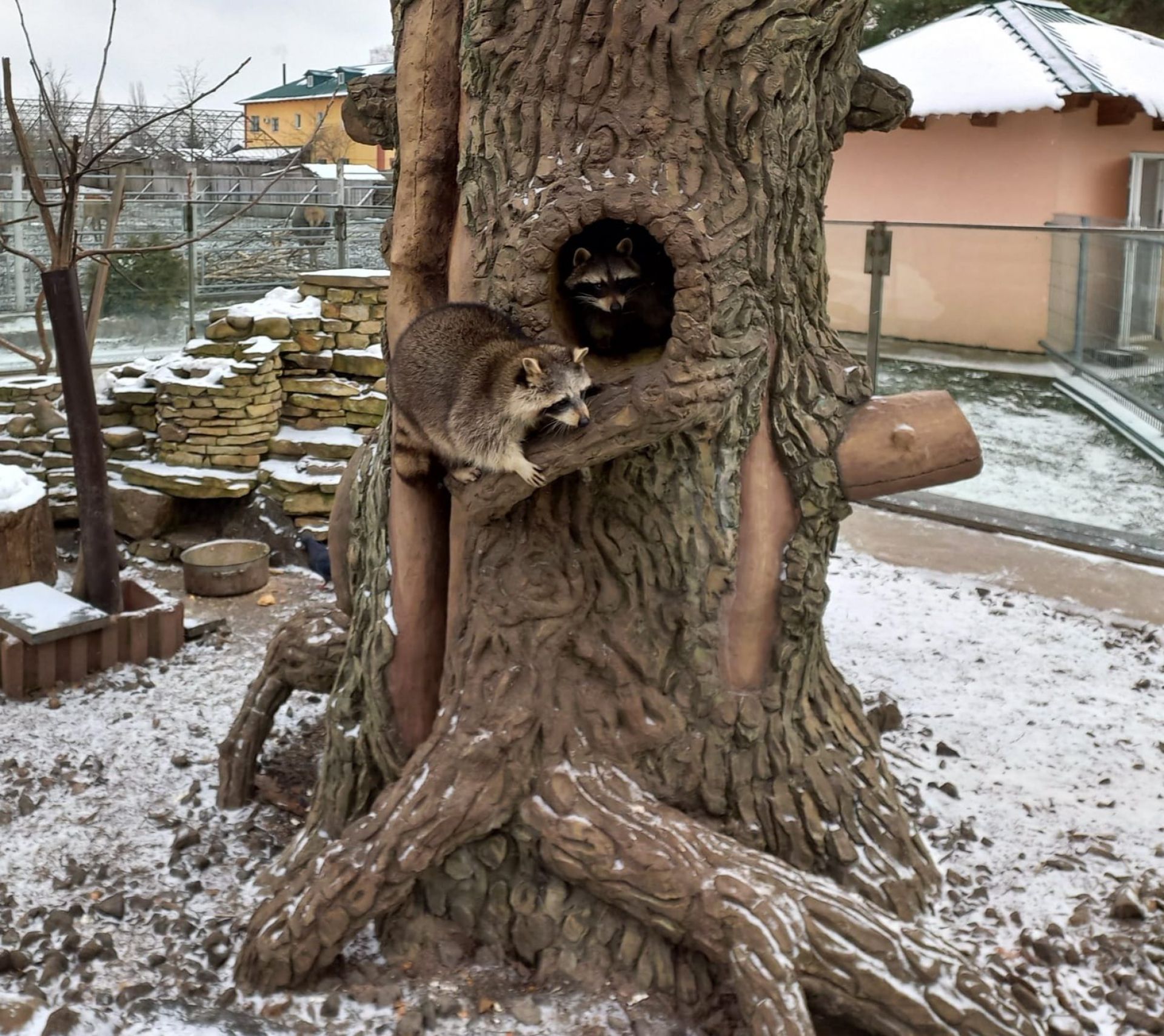 Попри морозну погоду у відкритих вольєрах і досі можна побачити єнотів-полоскунів. Вони виходять зі своїх схованок у пошуках смаколиків і майже одразу повертаються до своїх домівок.