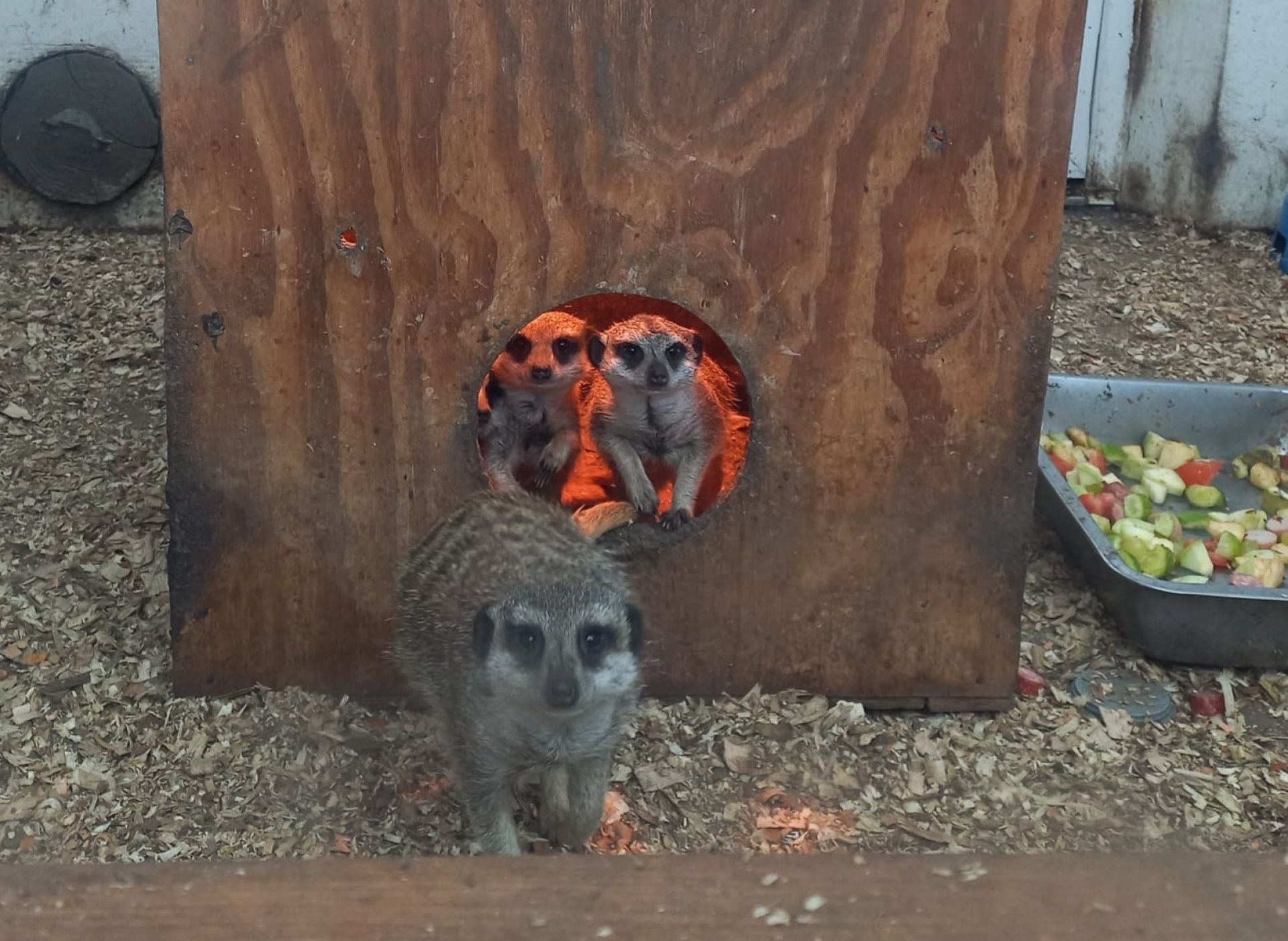 Як ми писали раніше, сурікати у відкритий вольєр вже не виходять. Втім, спостерігати за ними можна через скло зимівника. Улюблене місце малюків - будиночок. Зігріває цих непосидючих уродженців Африки інфрачервона лампа.