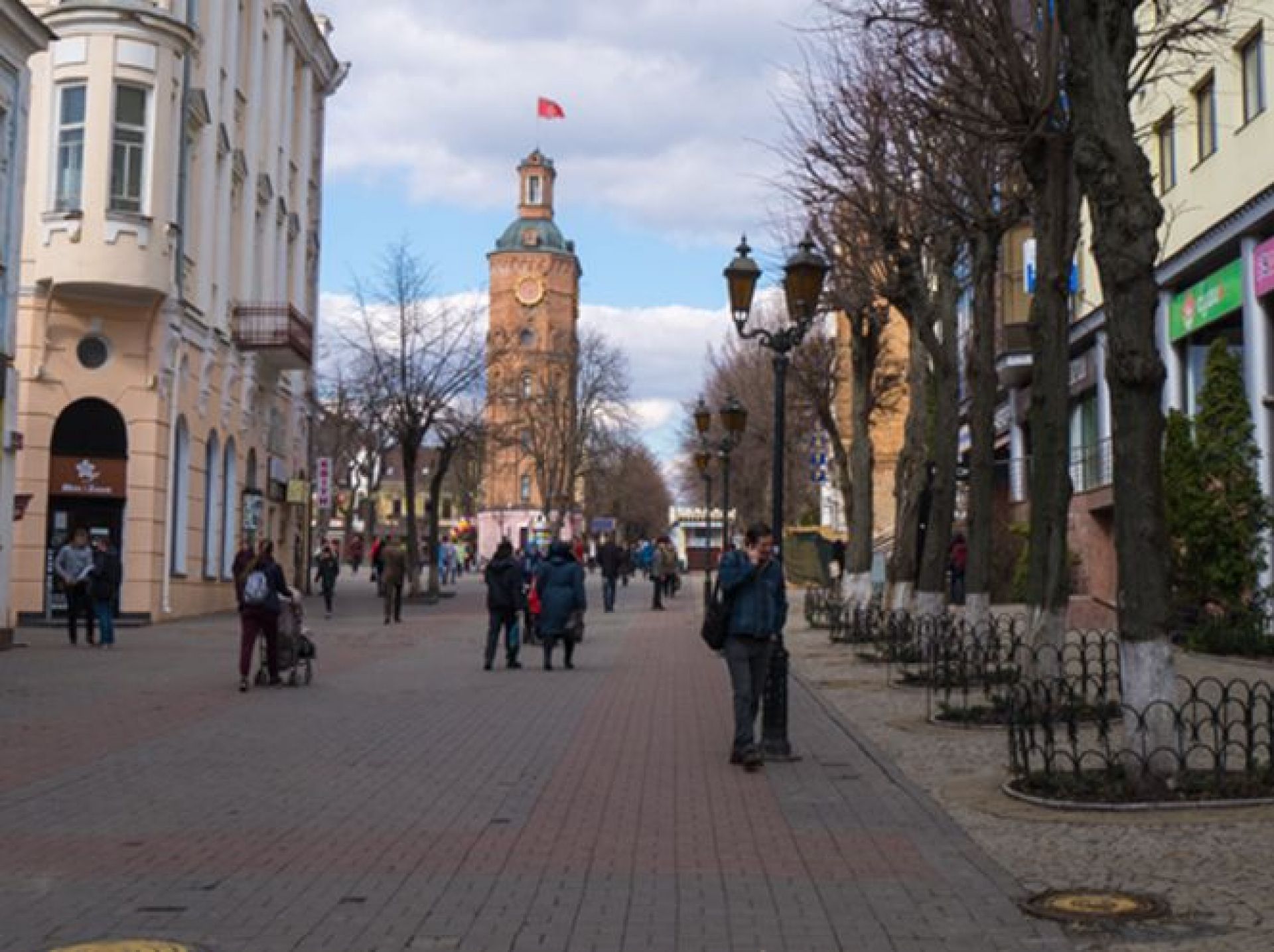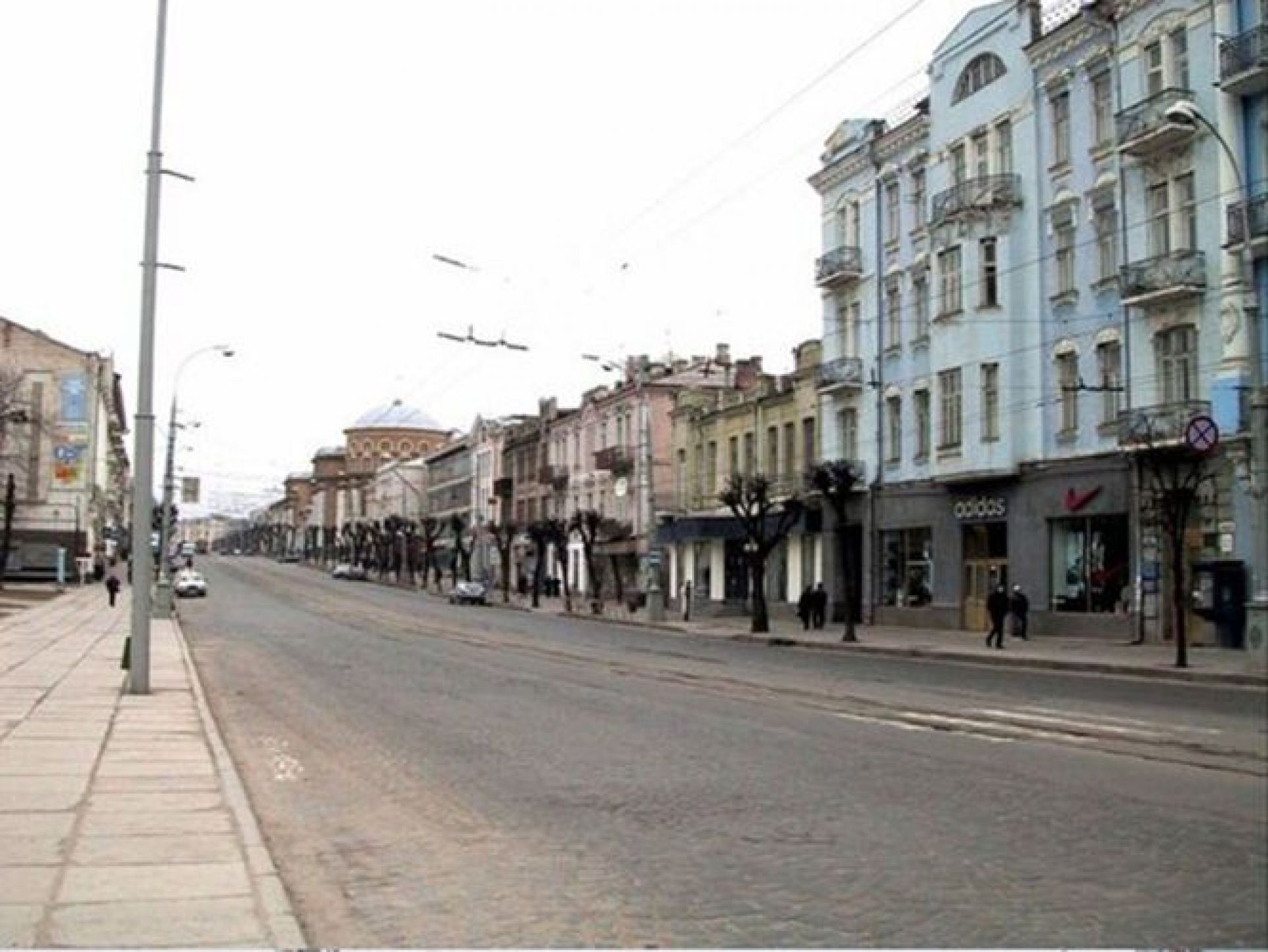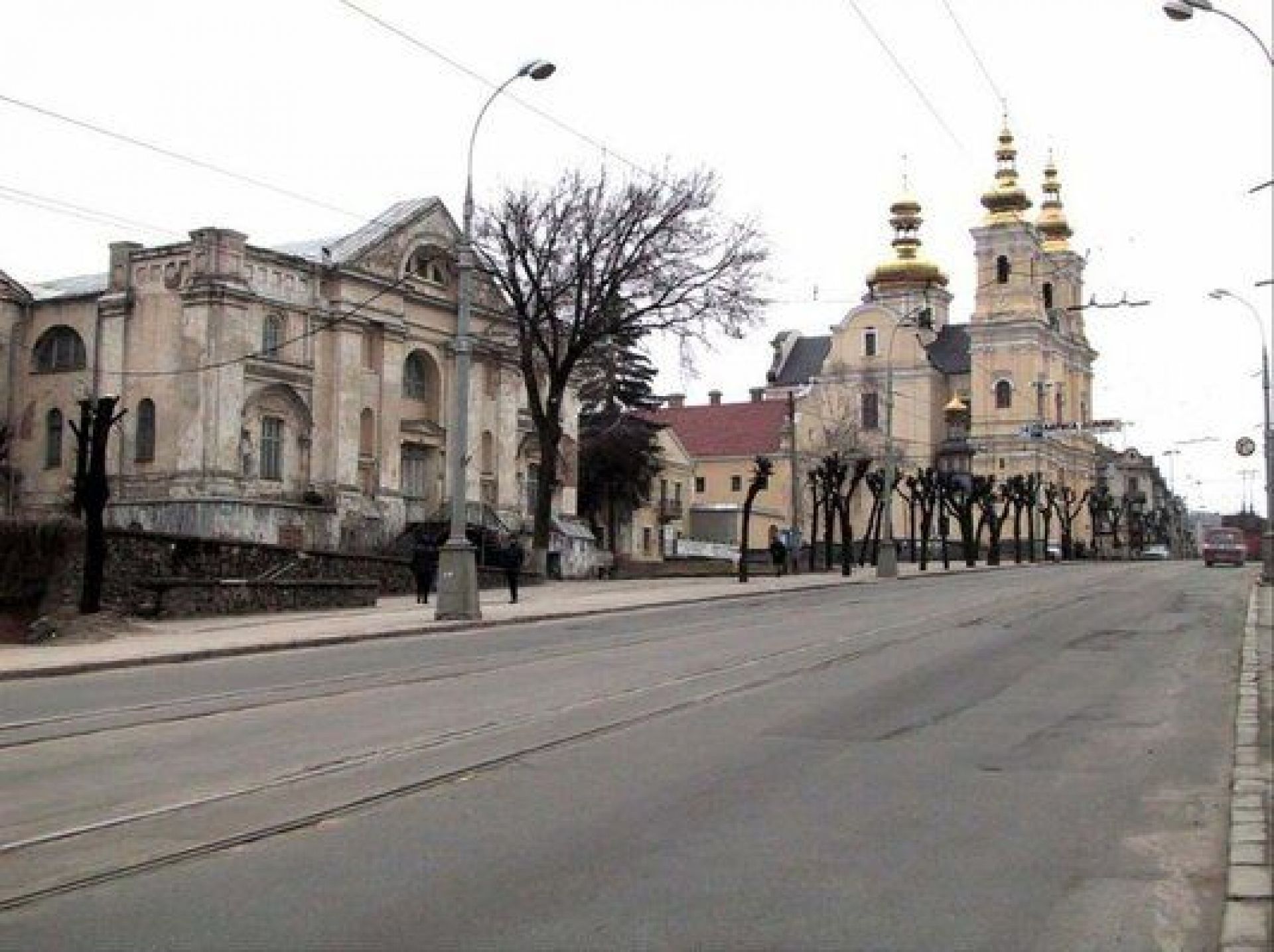 Но вот трамвай у костёла мешает порадоваться за магазин Рошен, перекрывший вид на Укртелеком.