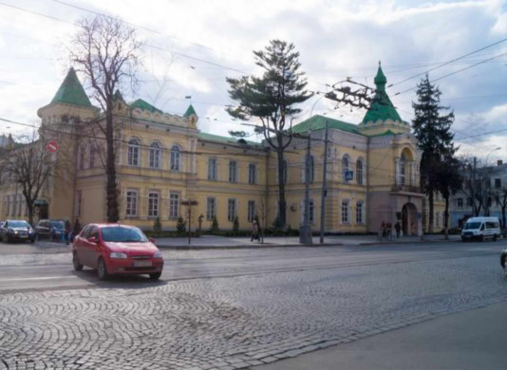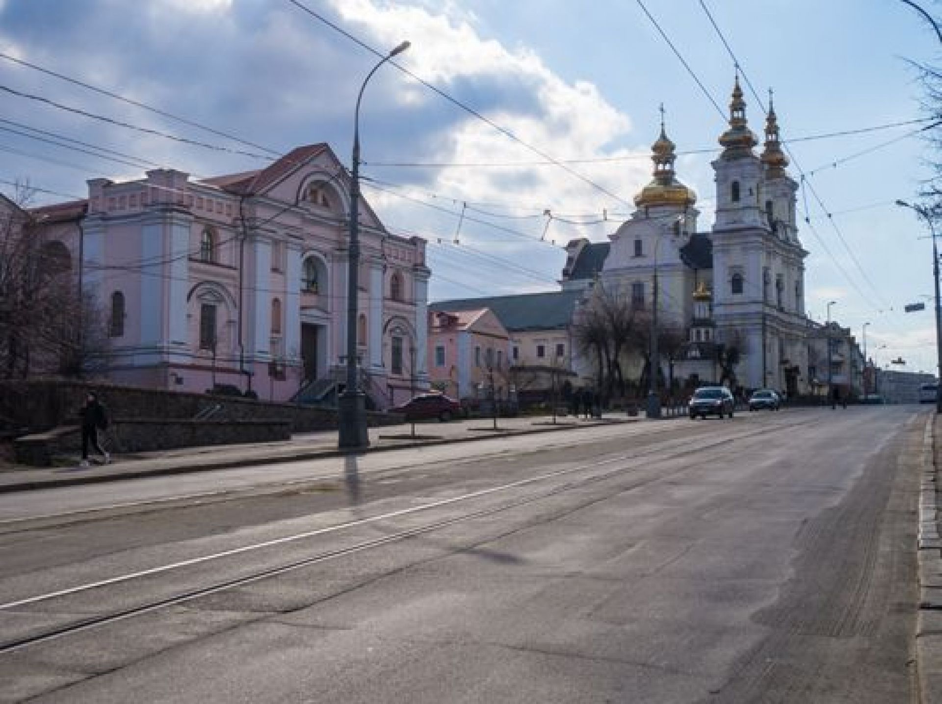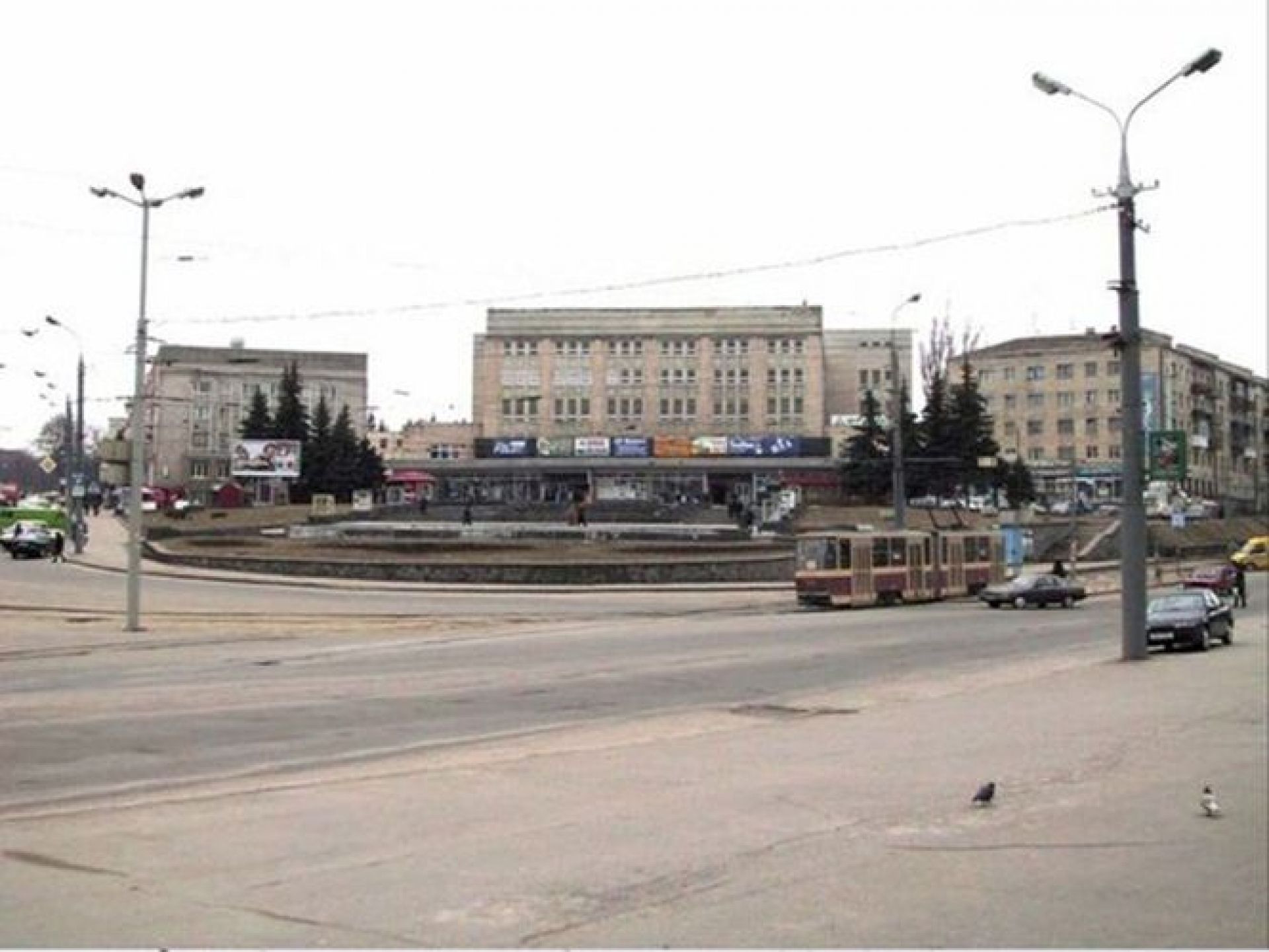 Но вот трамвай у костёла мешает порадоваться за магазин Рошен, перекрывший вид на Укртелеком.