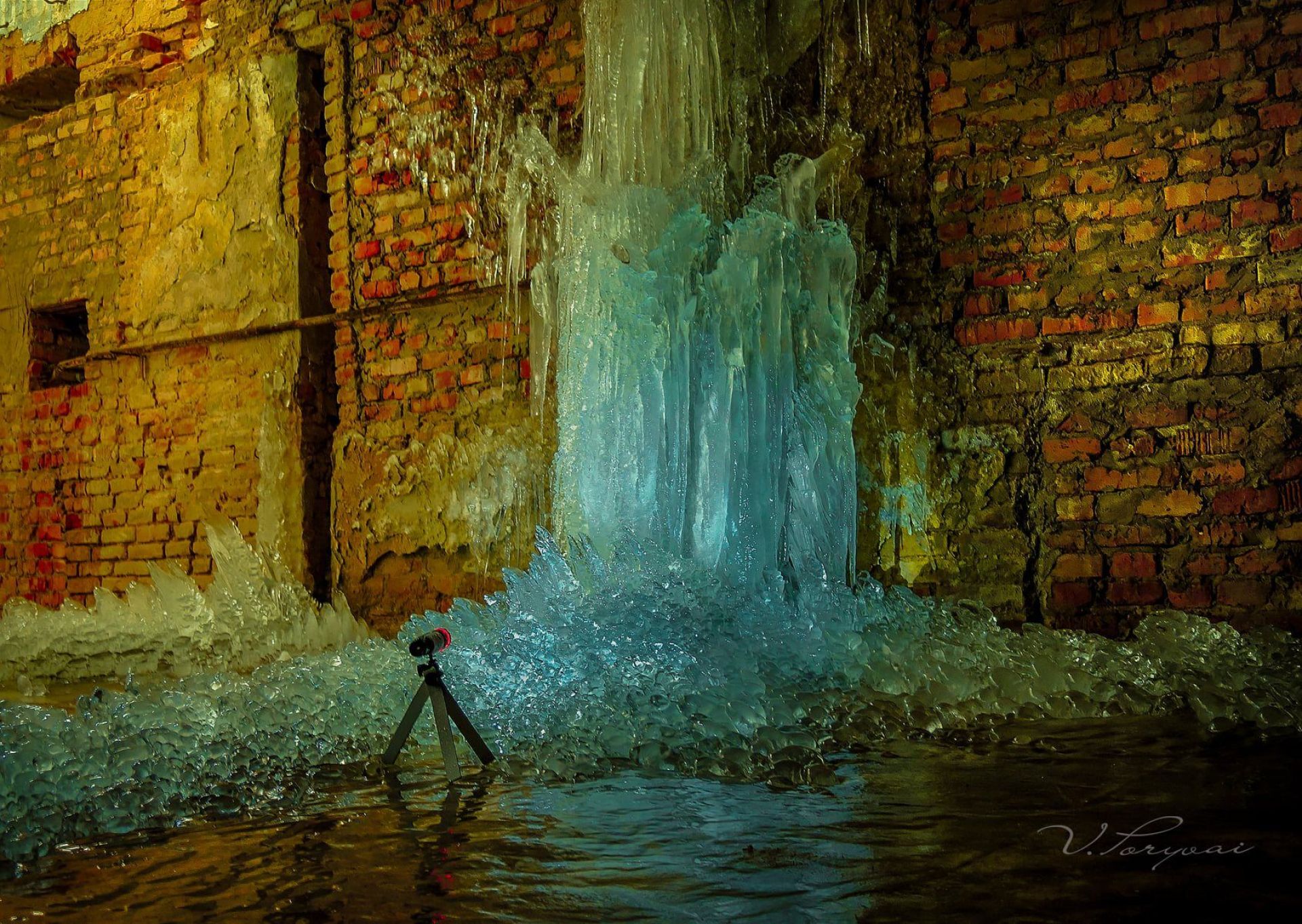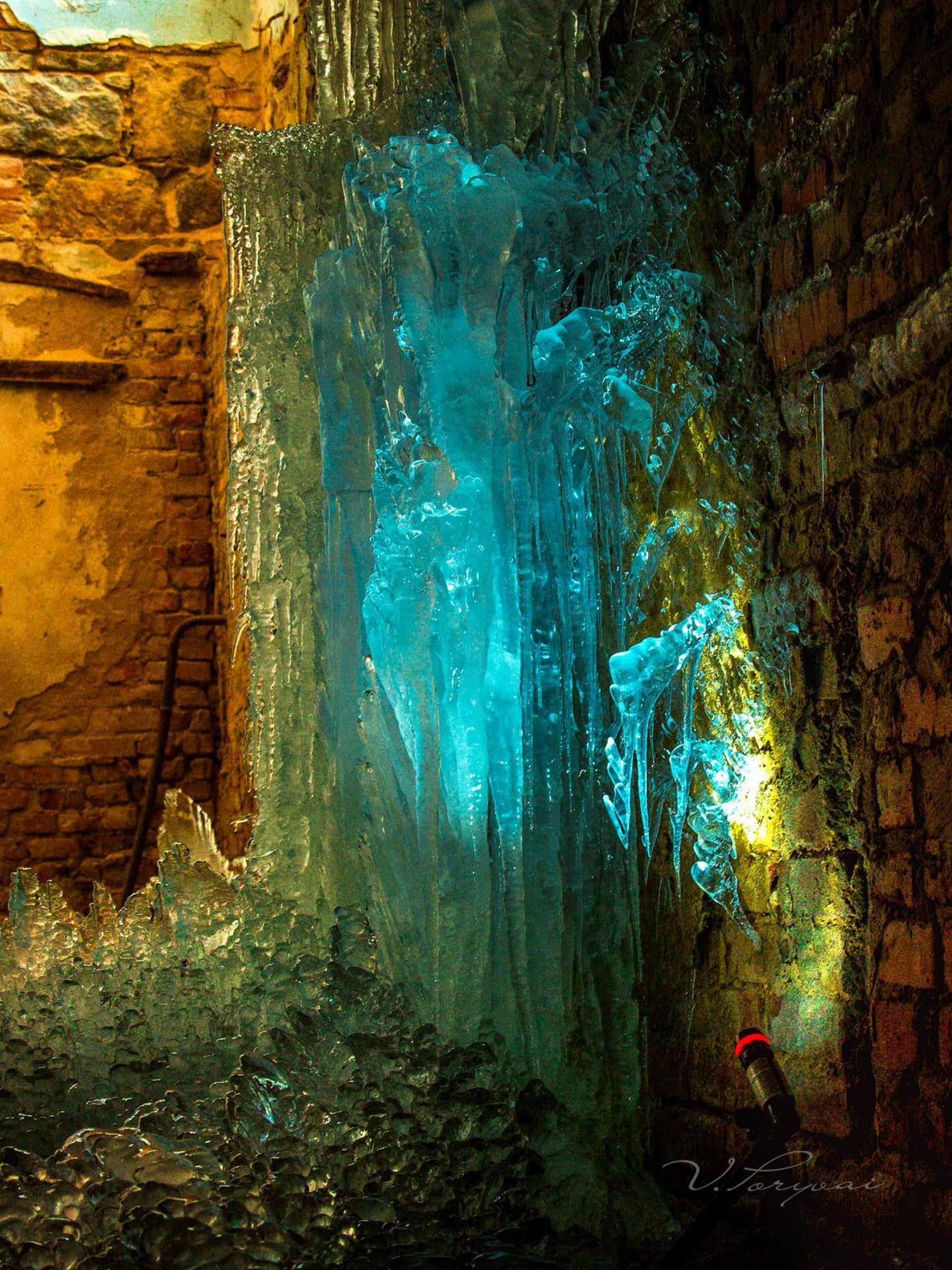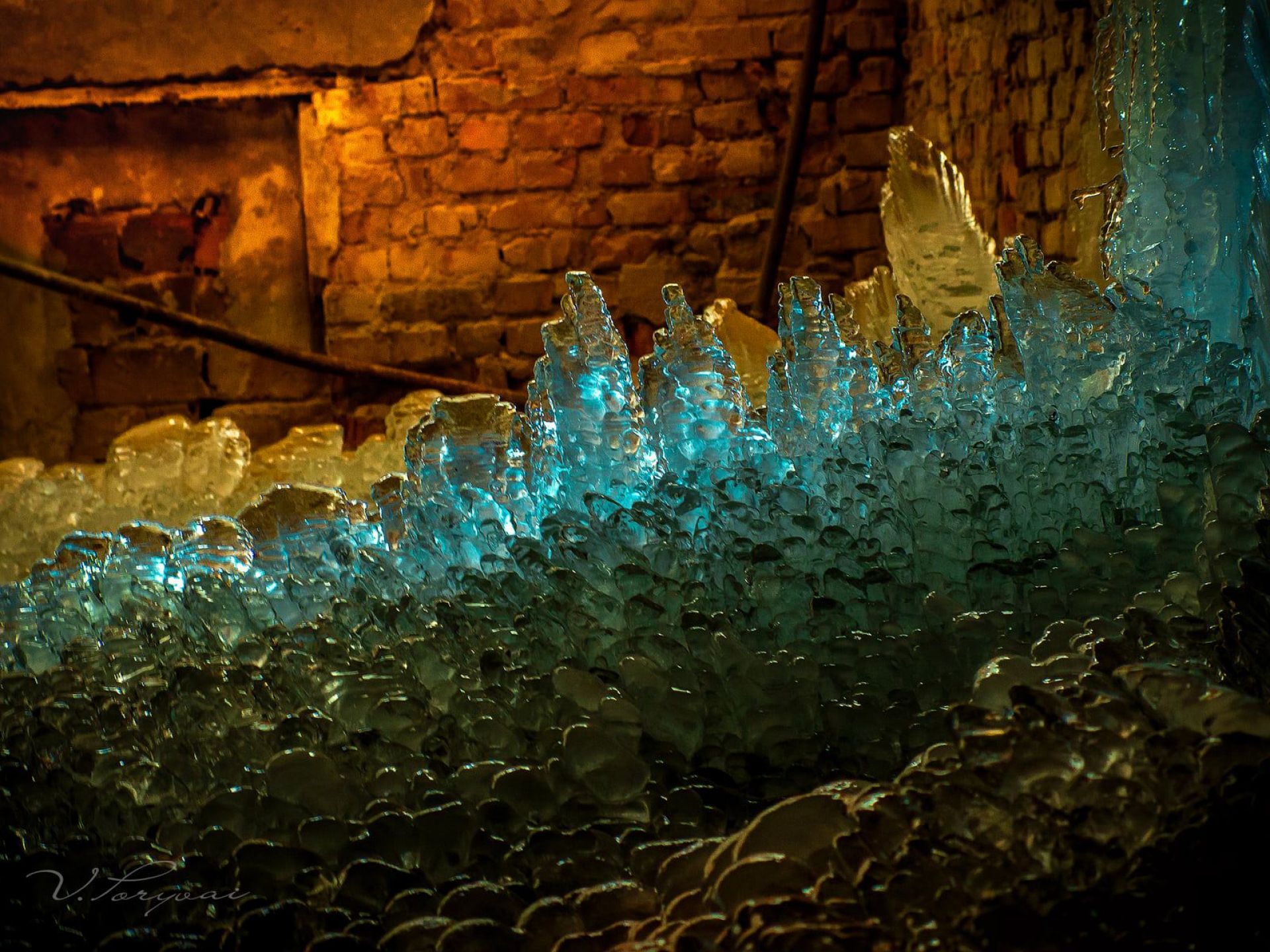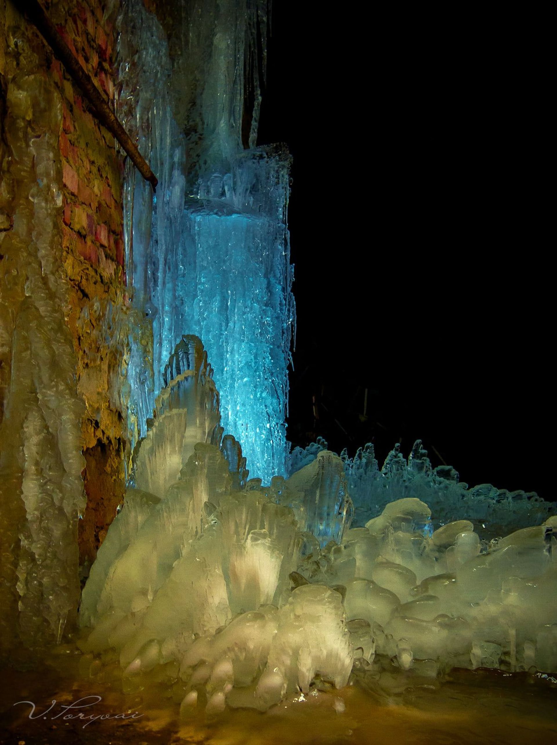 «Вода, просочившись через перекриття, при низьких температурах на цокольному поверсі формує такі цікаві утворення. Підсвічені виглядають просто казково», — пише фотограф.