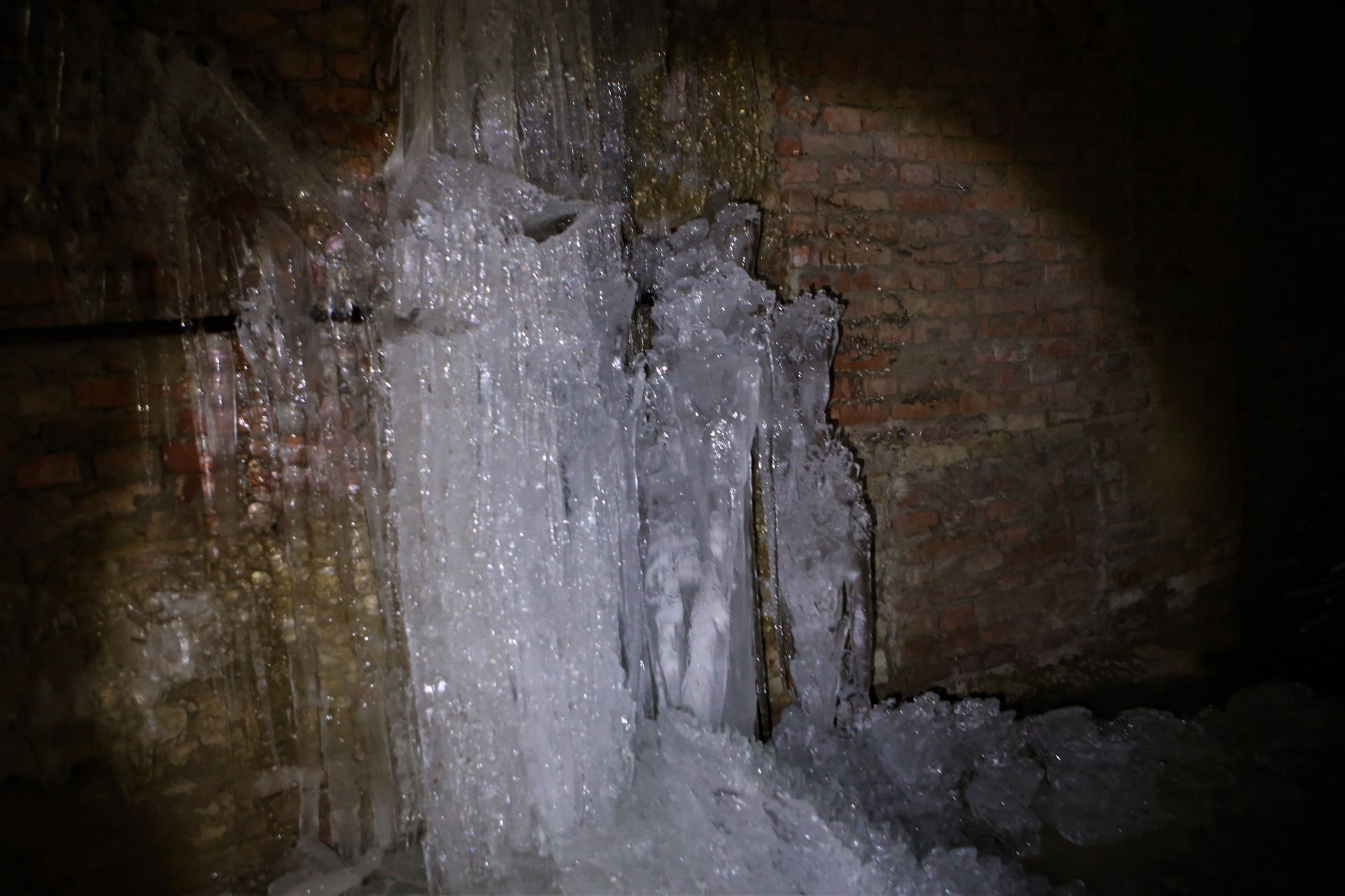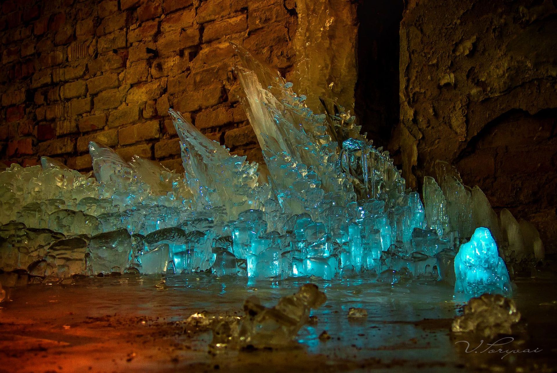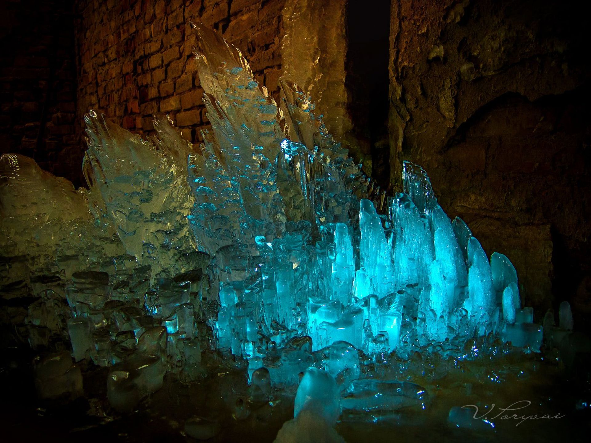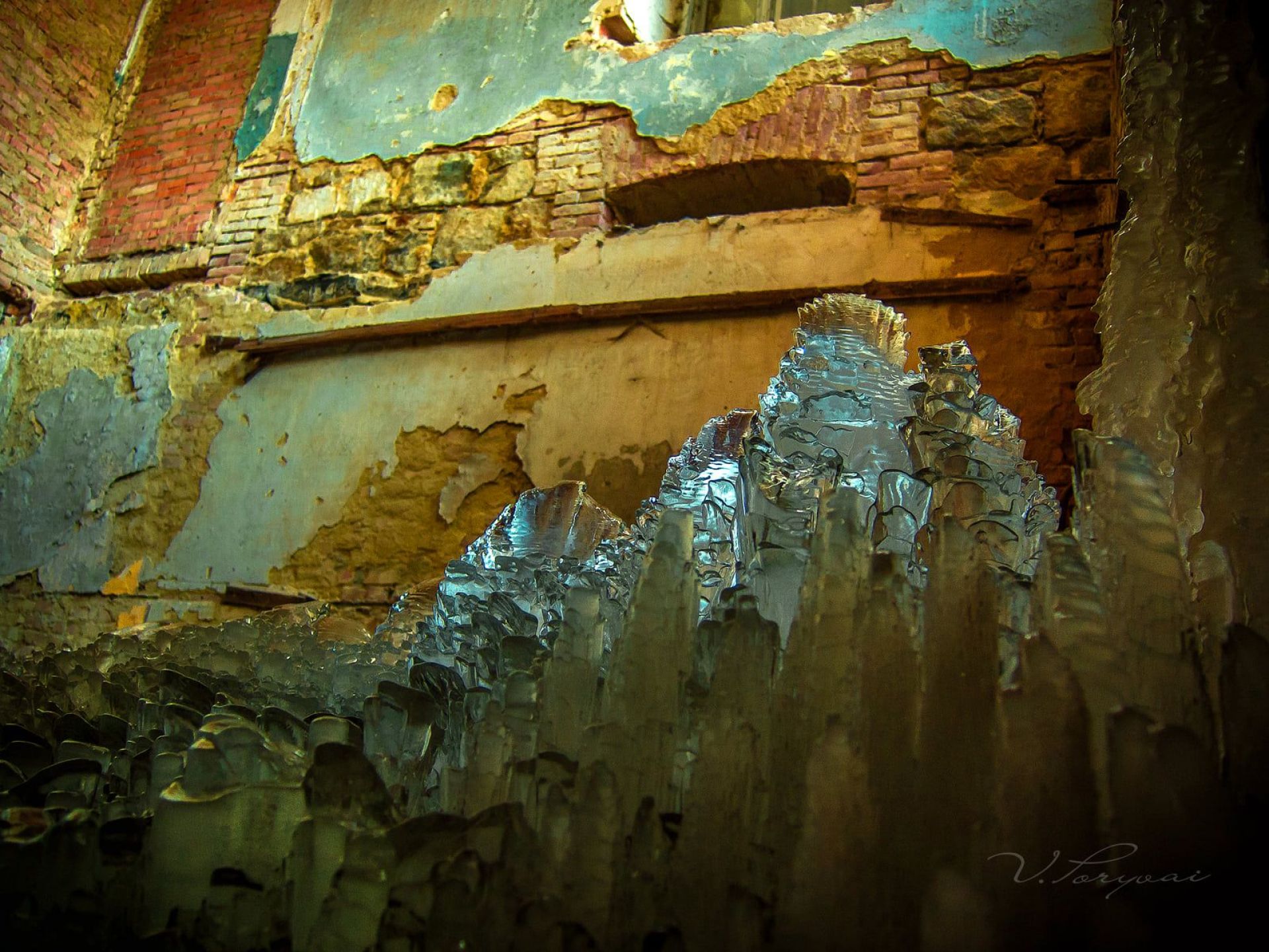 «Вода, просочившись через перекриття, при низьких температурах на цокольному поверсі формує такі цікаві утворення. Підсвічені виглядають просто казково», — пише фотограф.